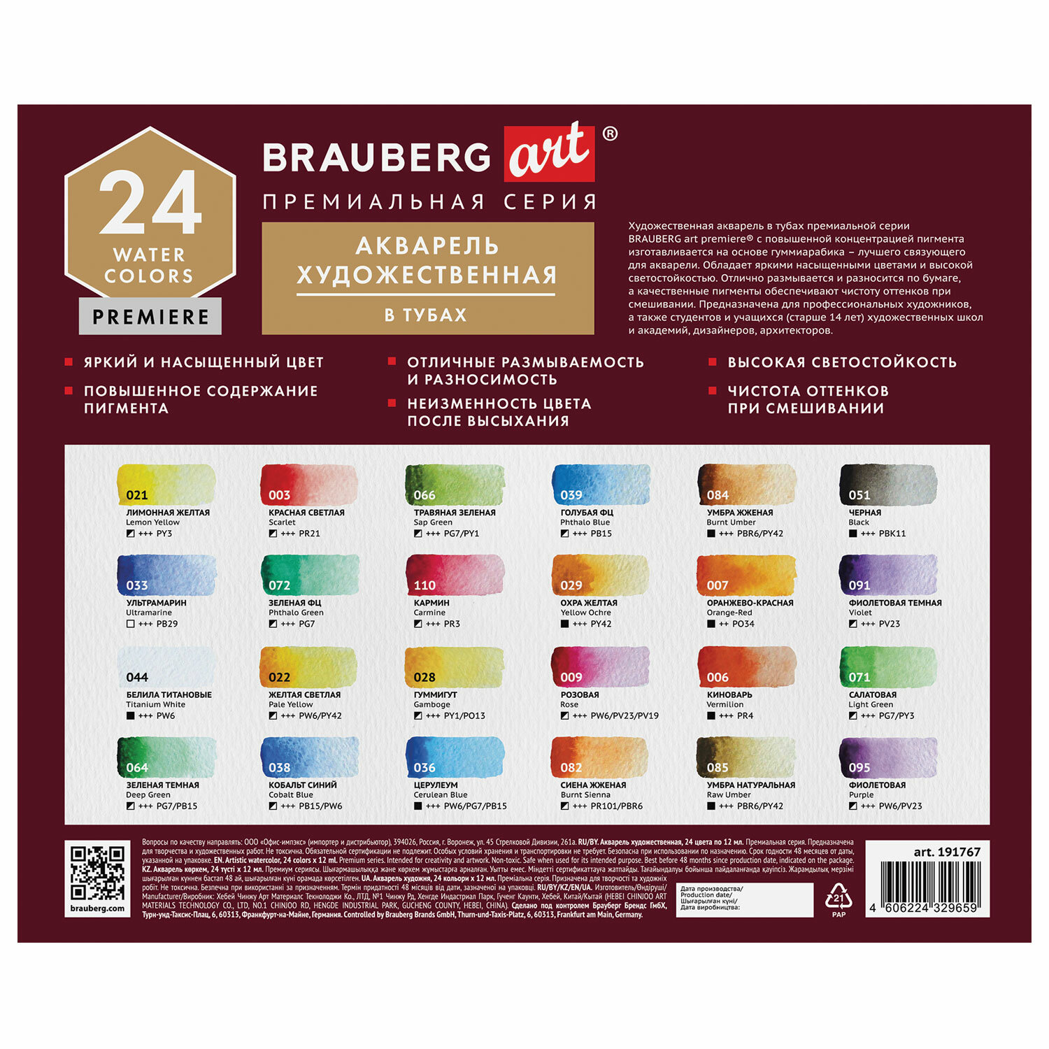 - Акварель художественная в тубах НАБОР 24 цвета по 12 мл, BRAUBERG ART PREMIERE, 191767