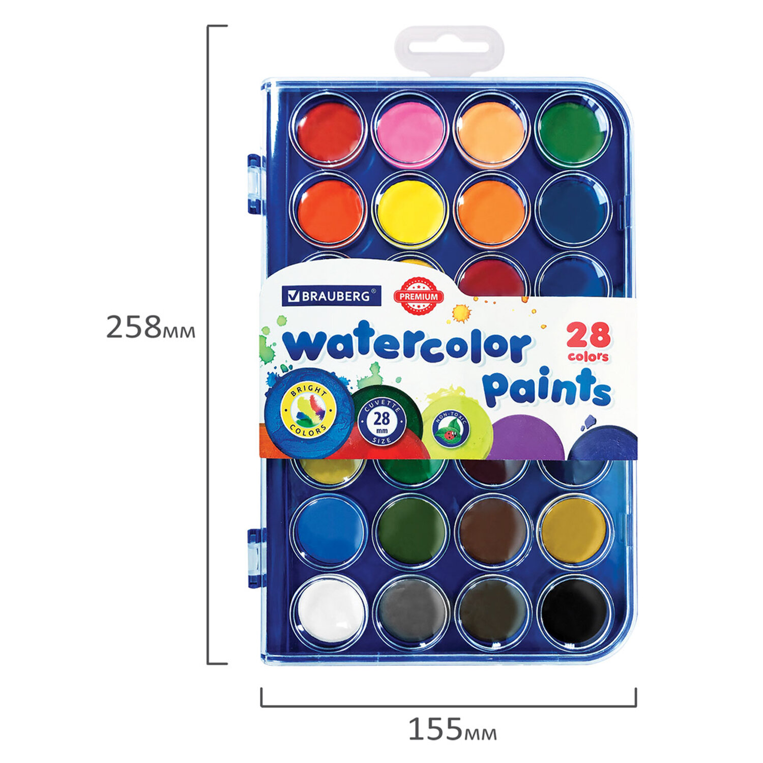 - Краски акварельные BRAUBERG "PREMIUM" 28 цветов, круглые кюветы 28 мм, пенал, 191745