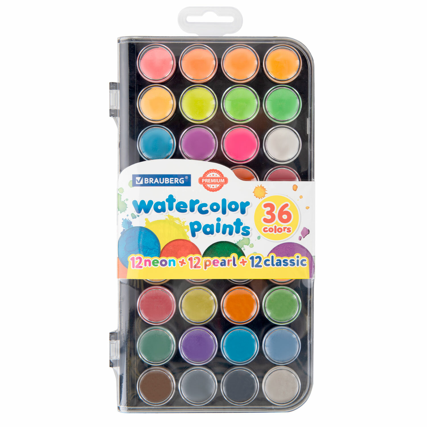 - Краски акварельные BRAUBERG "PREMIUM" 36 цветов (12 базовых + 12 неоновых + 12 металлик) пенал, 191807