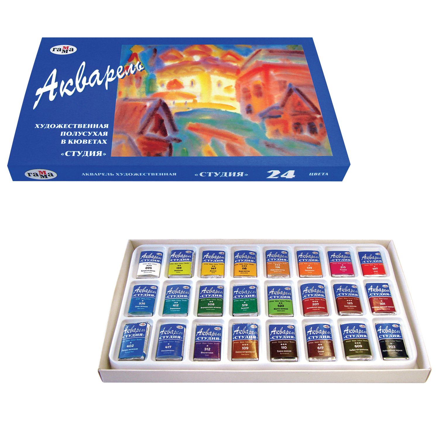 - Краски акварельные художественные ГАММА "Студия", 24 цвета, кювета 2,5 мл, картонная коробка, 215001