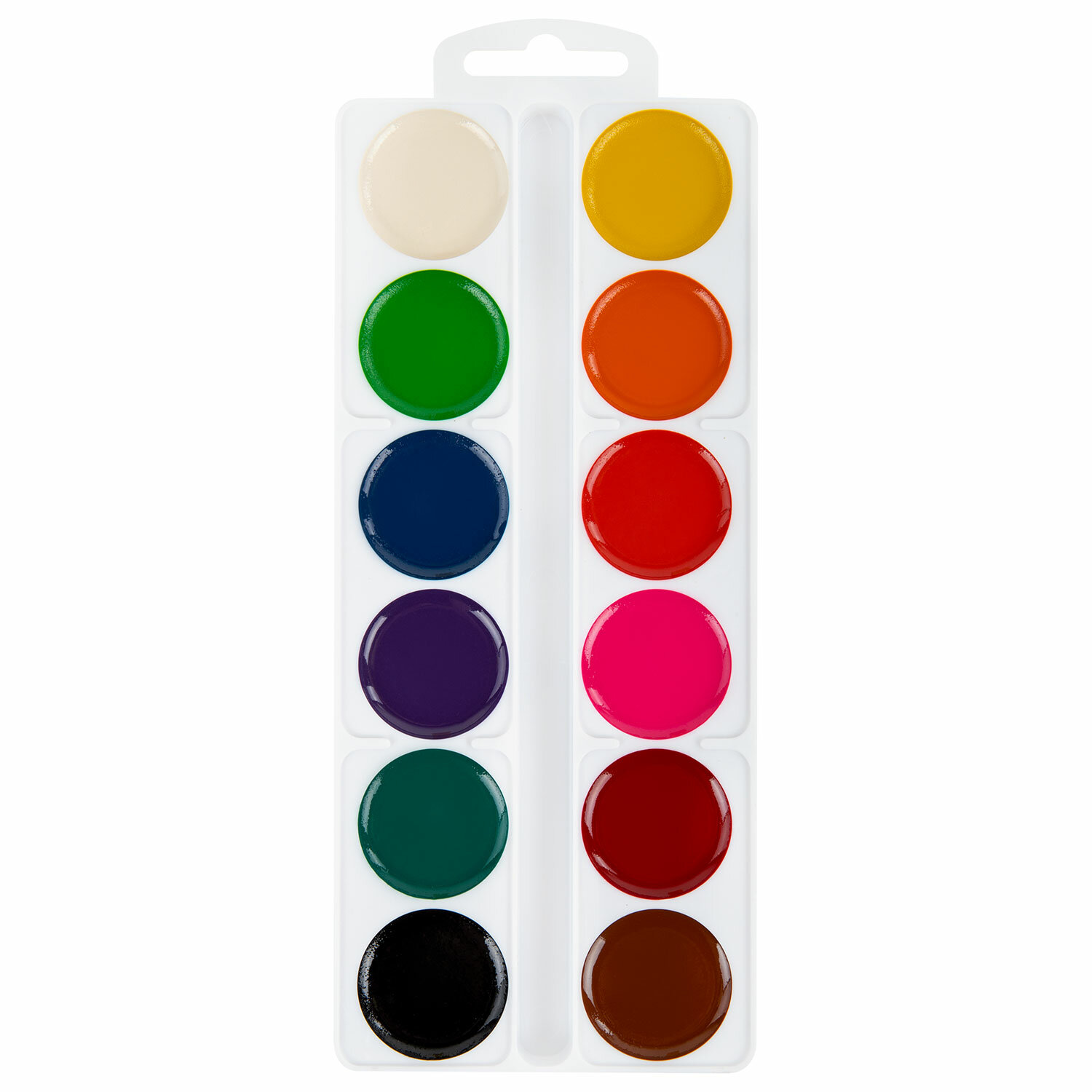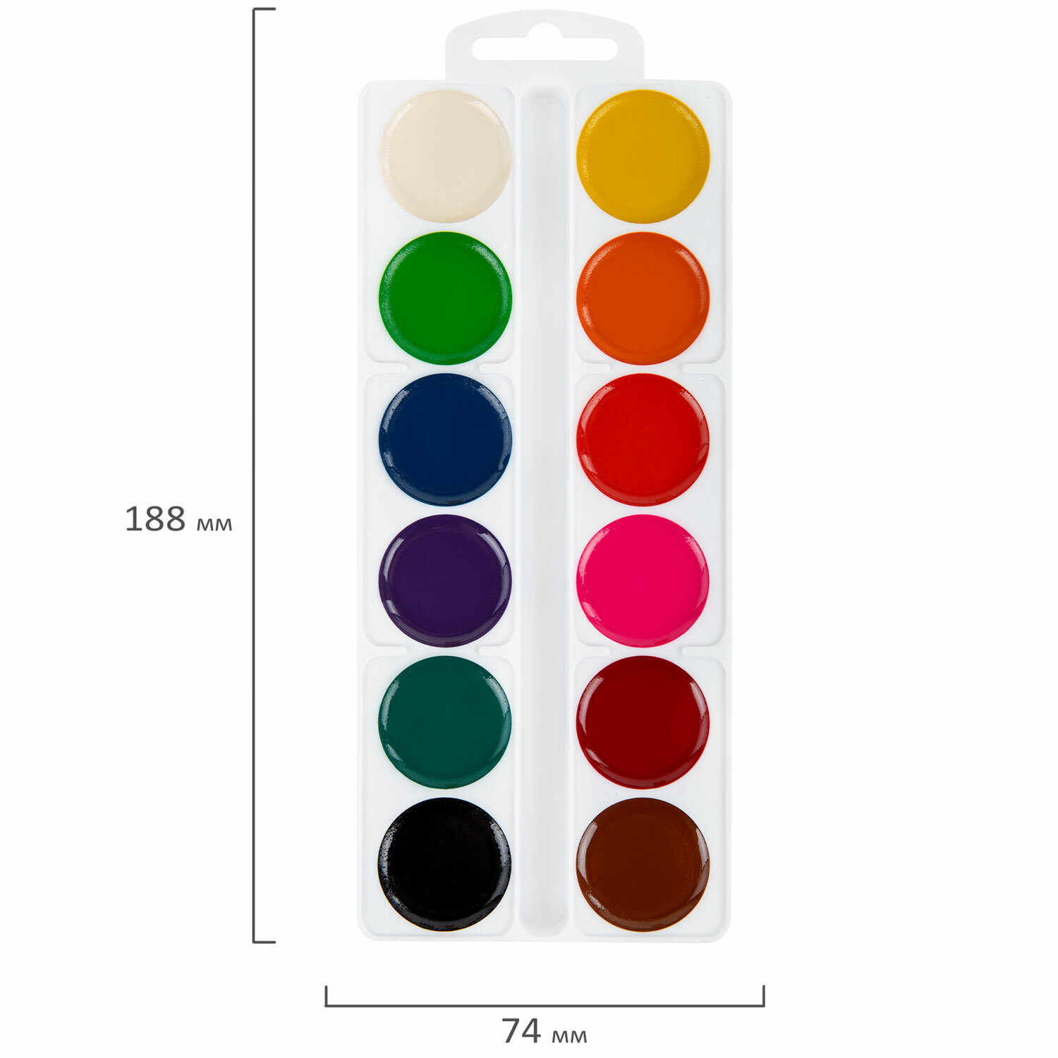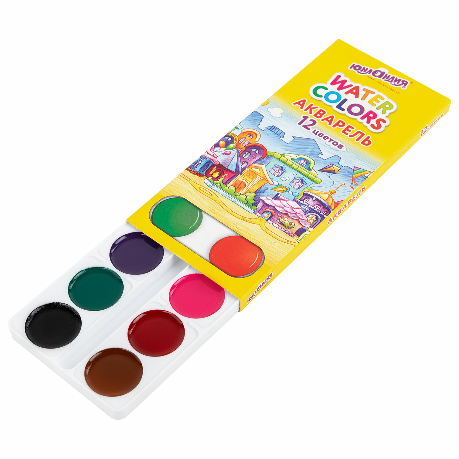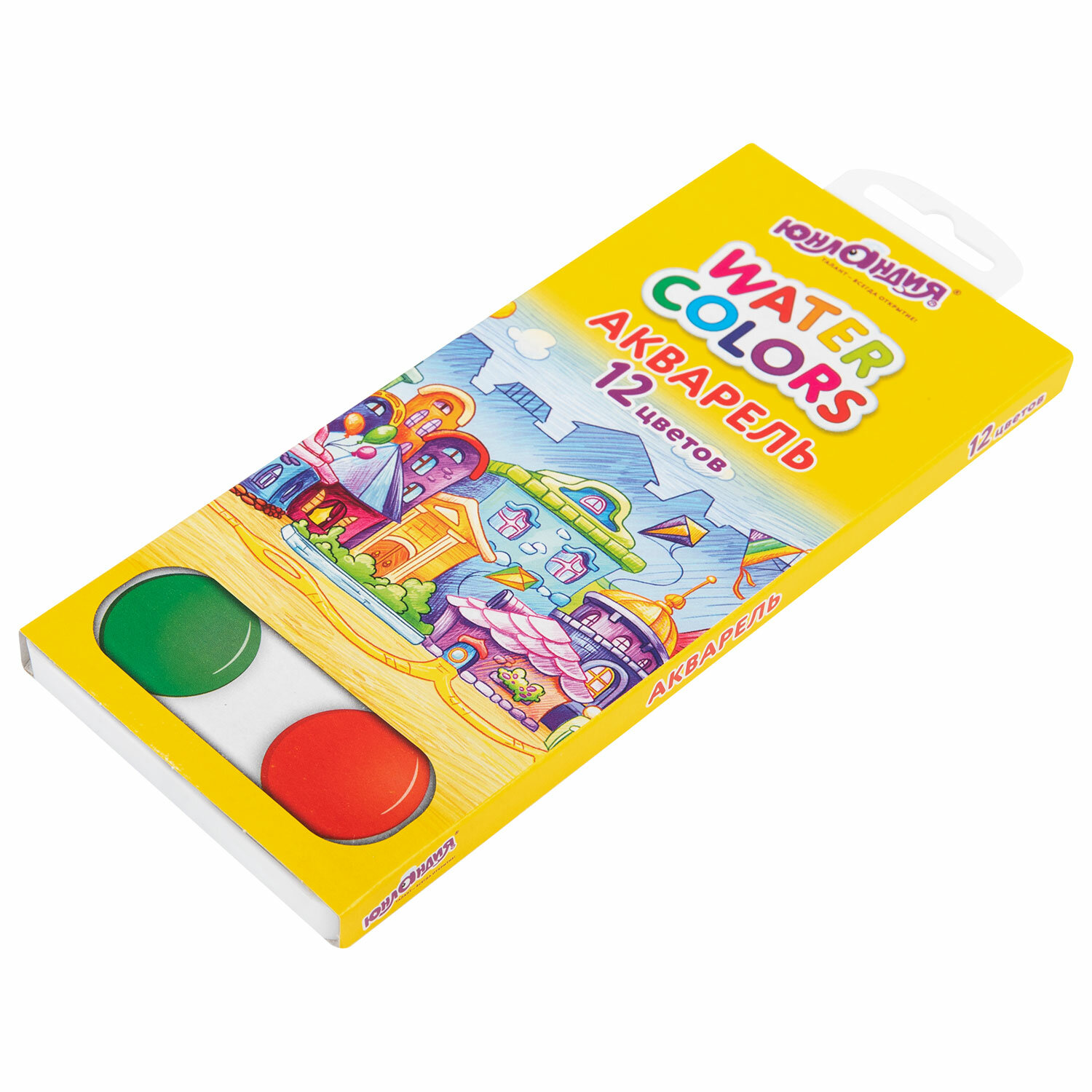 12 ярких насыщенных цветов отлично смешиваются между собой и позволяют создать множество оттенков, обеспечивают однородное окрашивание. Краски быстро высыхают и не портятся со временем. Безопасны для детей, нетоксичны. Выпускаются в картонной коробке с пластиковой подложкой, круглой формой кювет и отделением для кисточки. Упаковка обладает компактными размерами и легким весом. Краски акварельные ЮНЛАНДИЯ "ДОМИКИ", 12 цветов, медовые, круглые кюветы, 192550