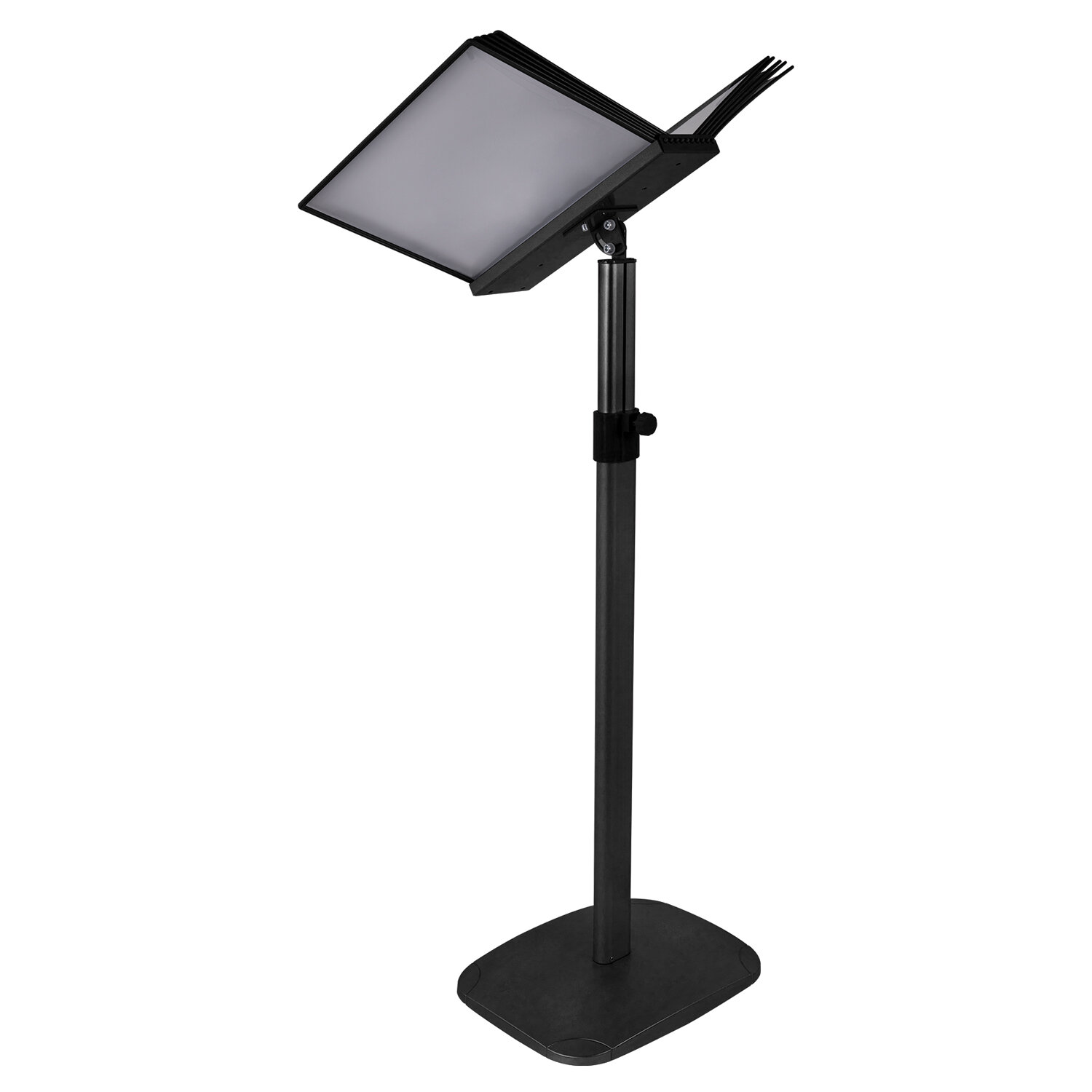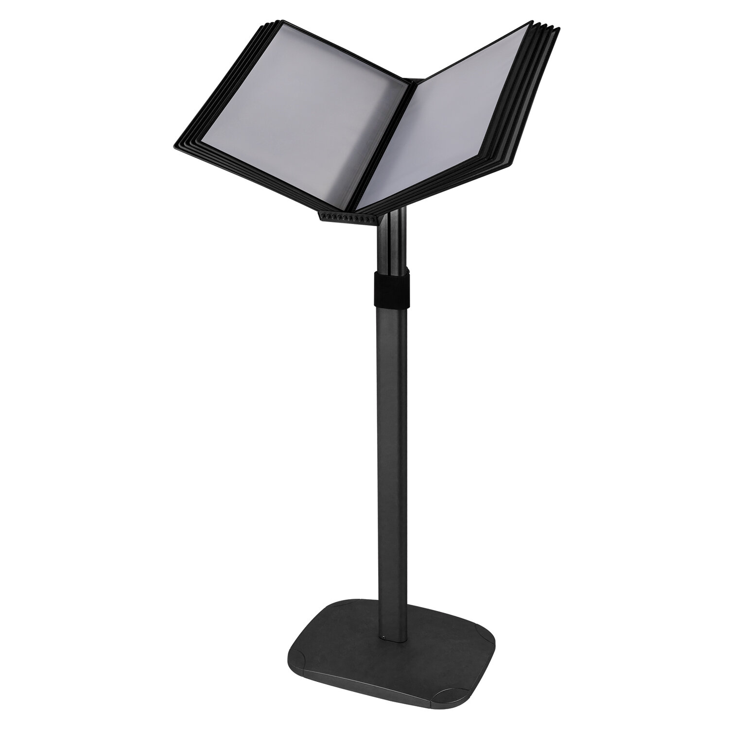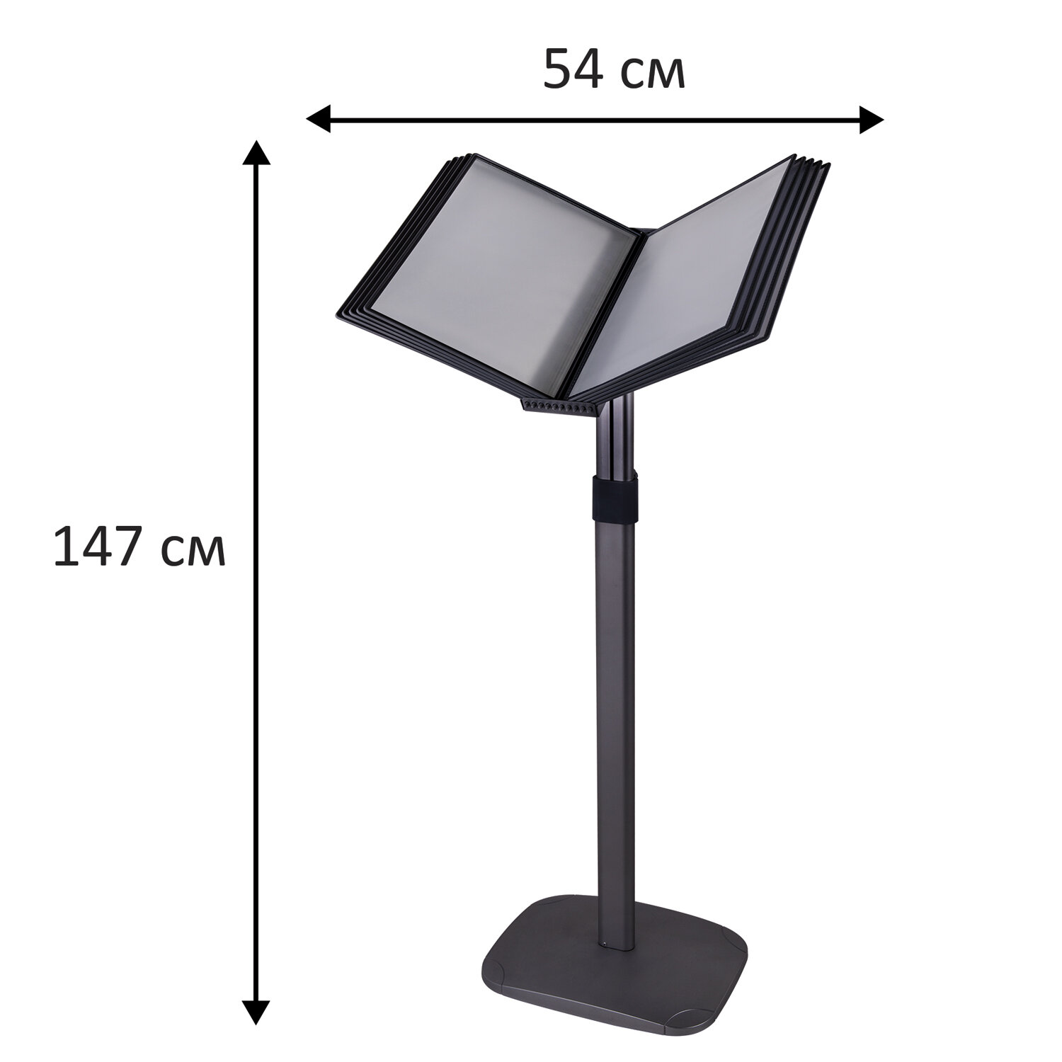 Стильный черный цвет металлического корпуса подойдёт для большинства современных интерьеров. Демосистема напольная на 10 панелей, черные панели А4, регулируемая высота, STAFF, 238335