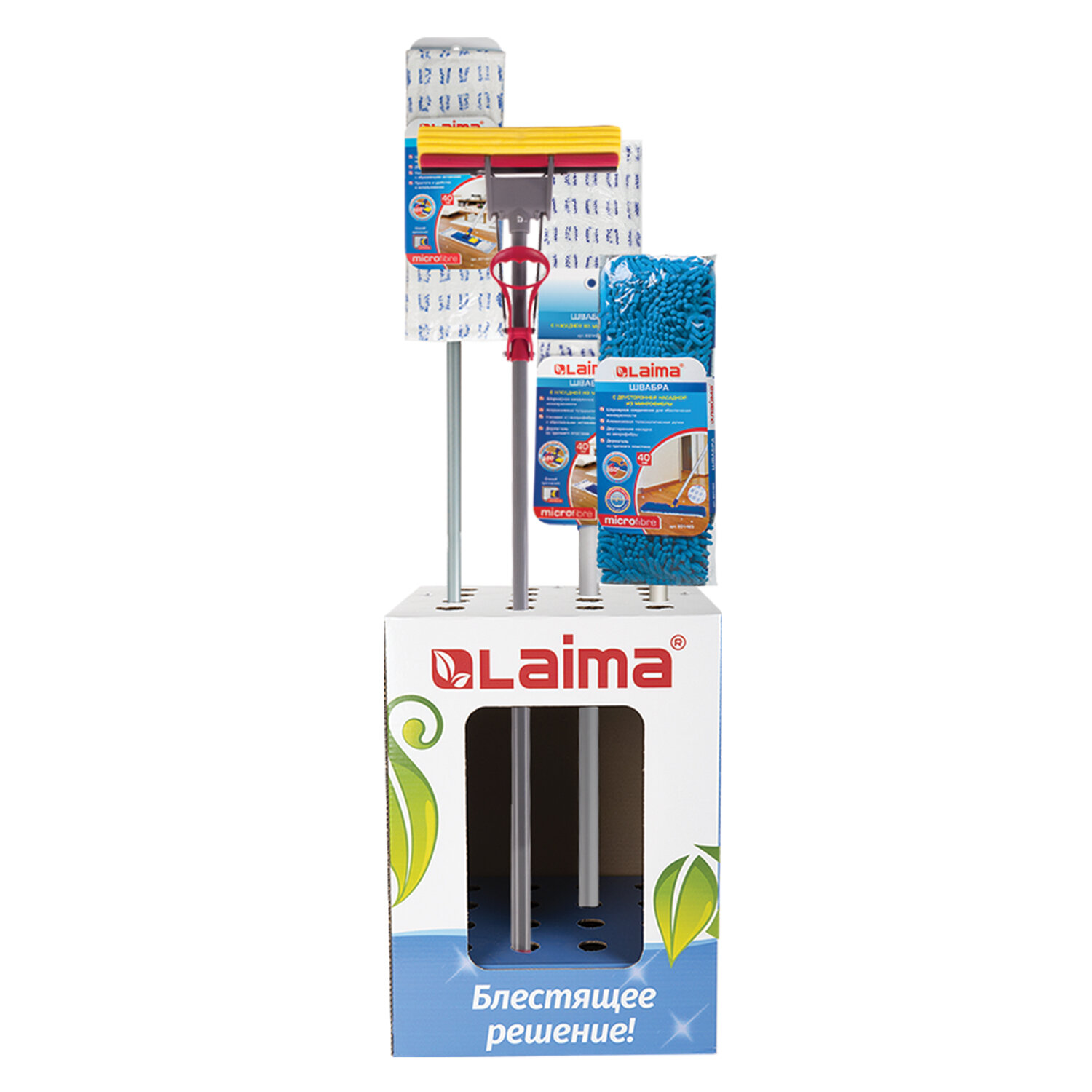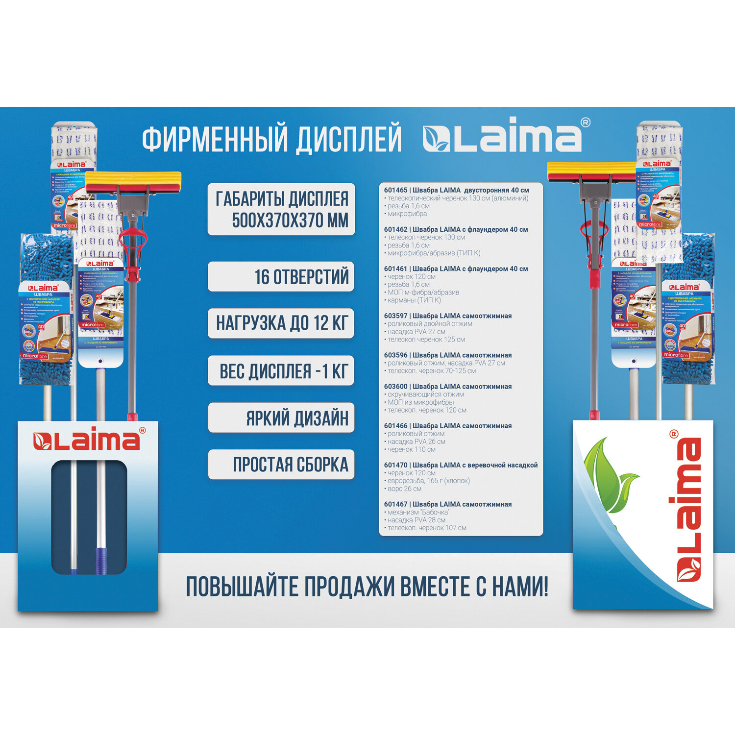 Дисплей позволяет разместить до 16 швабр таким образом, чтобы все представленные коды были в легком доступе для покупателей.