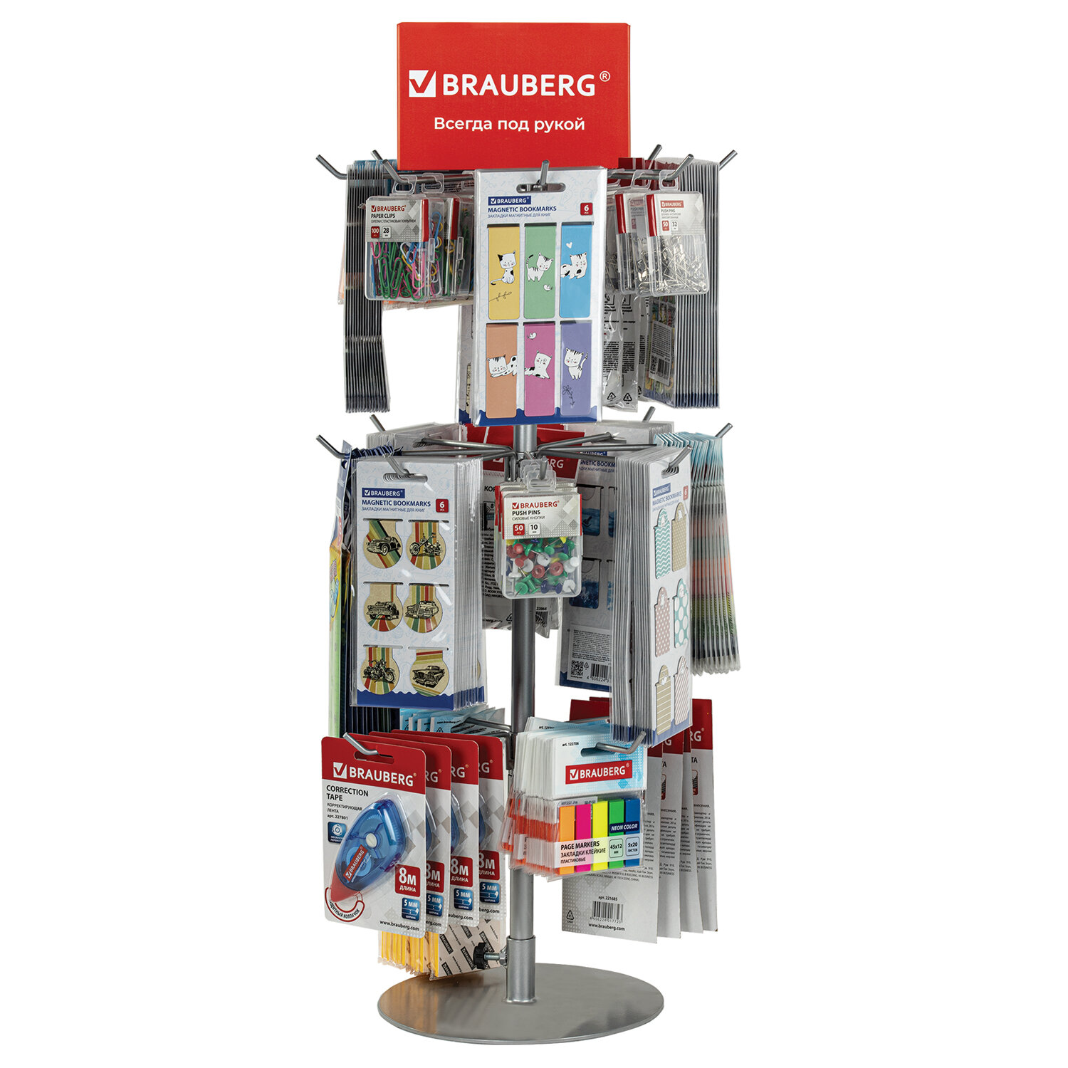 В комплект входит рекомендация по размещению продукции бренда – грамотная планограмма уже составлена специалистами группы компаний t;Самсонt;. Стойка-вертушка настольная BRAUBERG, 68х28 см, 20 крючков, 3 вращающихся ряда, 505911