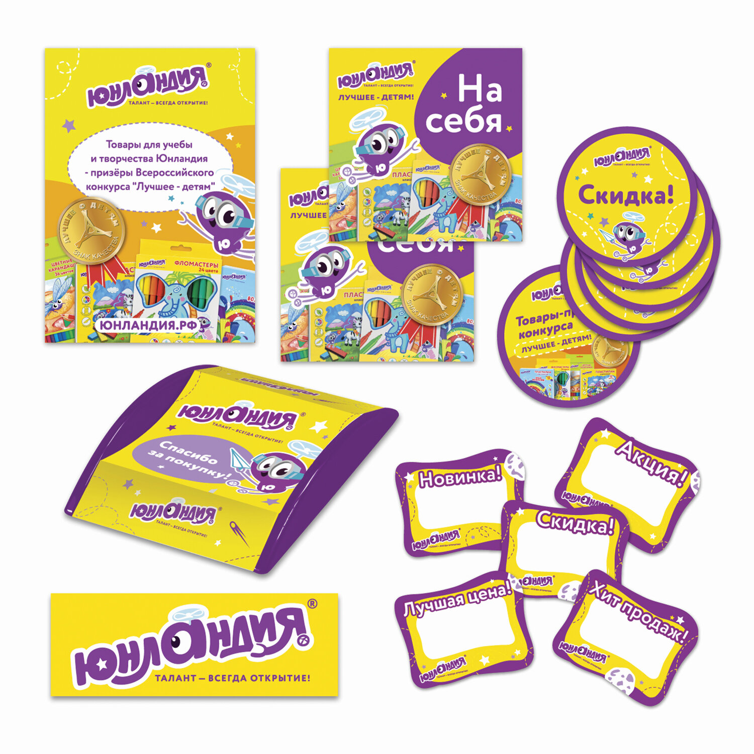 Комплект предназначен для выделения товаров бренда ЮНЛАНДИЯ на полках розничных магазинов. POS-аксессуары создают эффект выгоды, а покупатели любят акции, скидки и снижение цен. Привлеките их внимание к ярким и красочным товарам ЮНЛАНДИЯ.