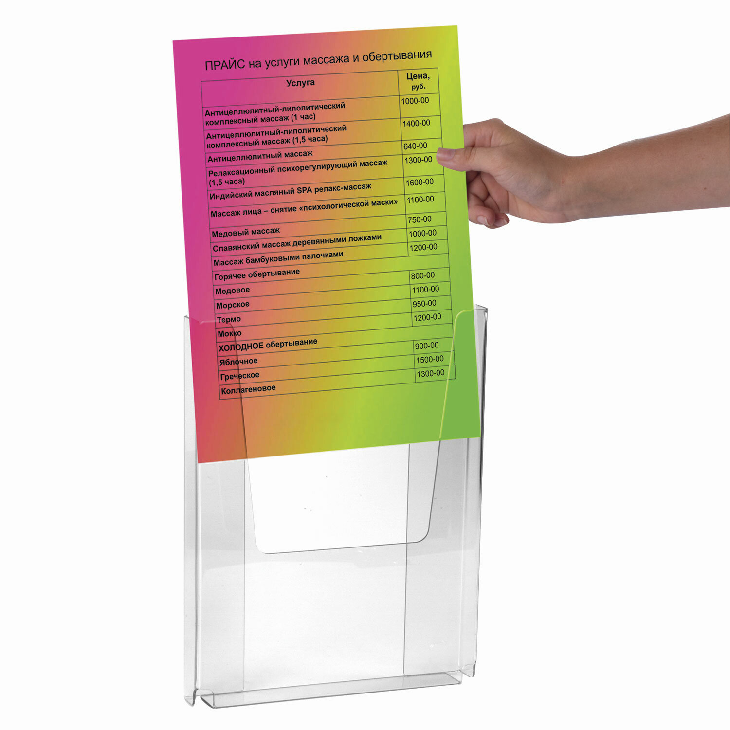 Изготовлена из прозрачного акрилового стекла. Предназначена для настенного размещения. В защитной плёнке. Крепления в комплект не входят. Подставка настенная для рекламных материалов ВЕРТИКАЛЬНАЯ (280х215х32 мм), А4, STAFF, 291173