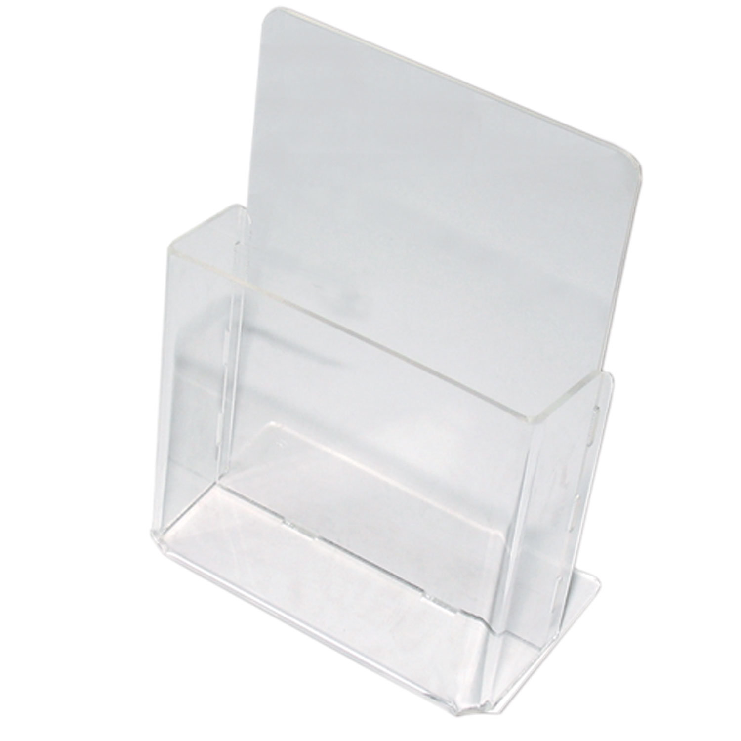 Настольная подставка с высоким бортом. Вмещает по несколько листовок и буклетов одновременно. Изготовлена под формат 1/3 А4. Сделана из идеально прозрачного акрилового стекла. Подставка настольная для рекламных материалов МАЛОГО ФОРМАТА (115х32 мм), для узких буклетов, №106