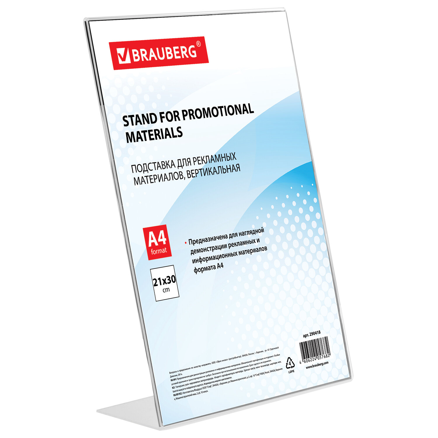 Изготовлена из прозрачного акрилового стекла. Предназначена для настольного размещения. Формат А4 и меньше. Максимальная высота вставляемого листа - 297 мм, максимальная ширина вставляемого листа - 210 мм. Подставка настольная для рекламных материалов ВЕРТИКАЛЬНАЯ (210х297 мм), А4, односторонняя, BRAUBERG, 290418