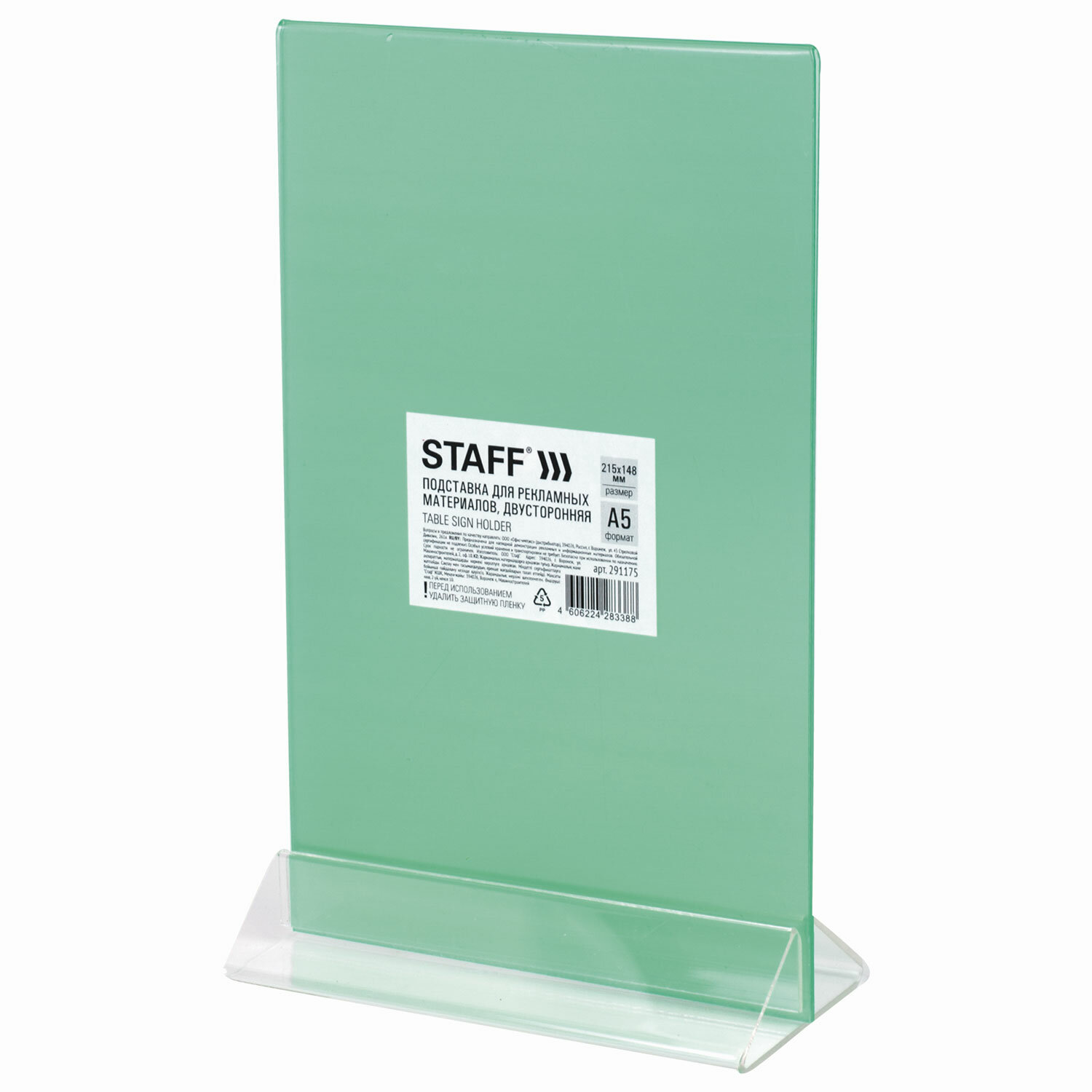 Изготовлена из прозрачного акрилового стекла. Предназначена для настольного размещения. Упакована в полиэтилен. Подставка настольная для рекламных материалов ВЕРТИКАЛЬНАЯ (215х148 мм), формат А5, двусторонняя, STAFF, 291175