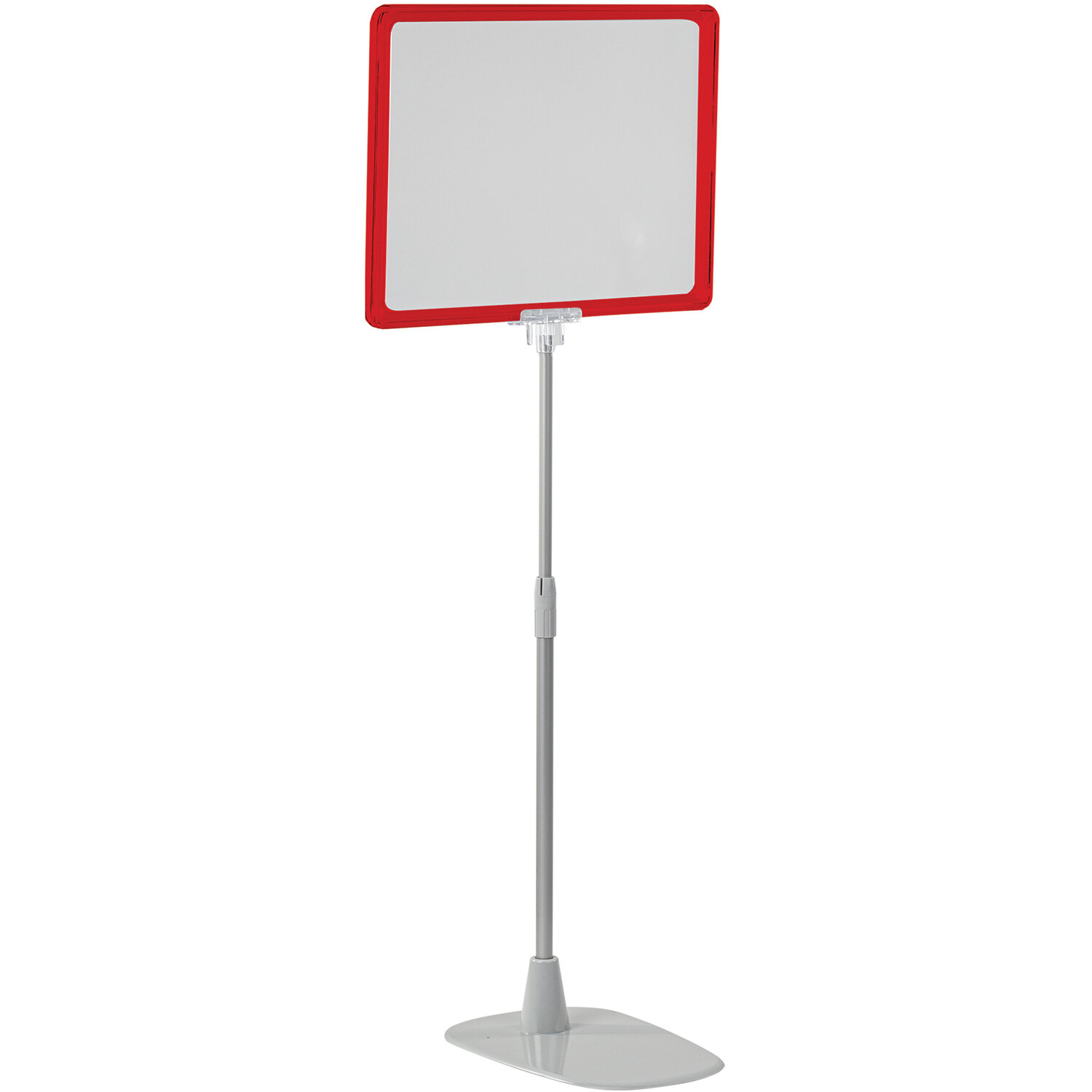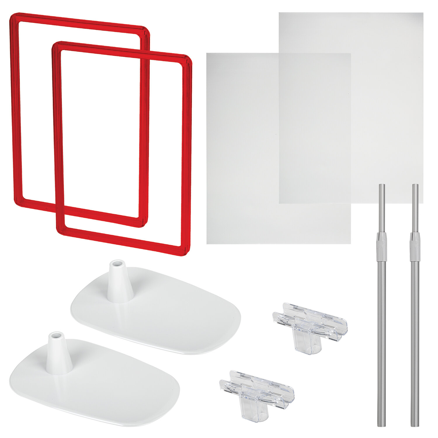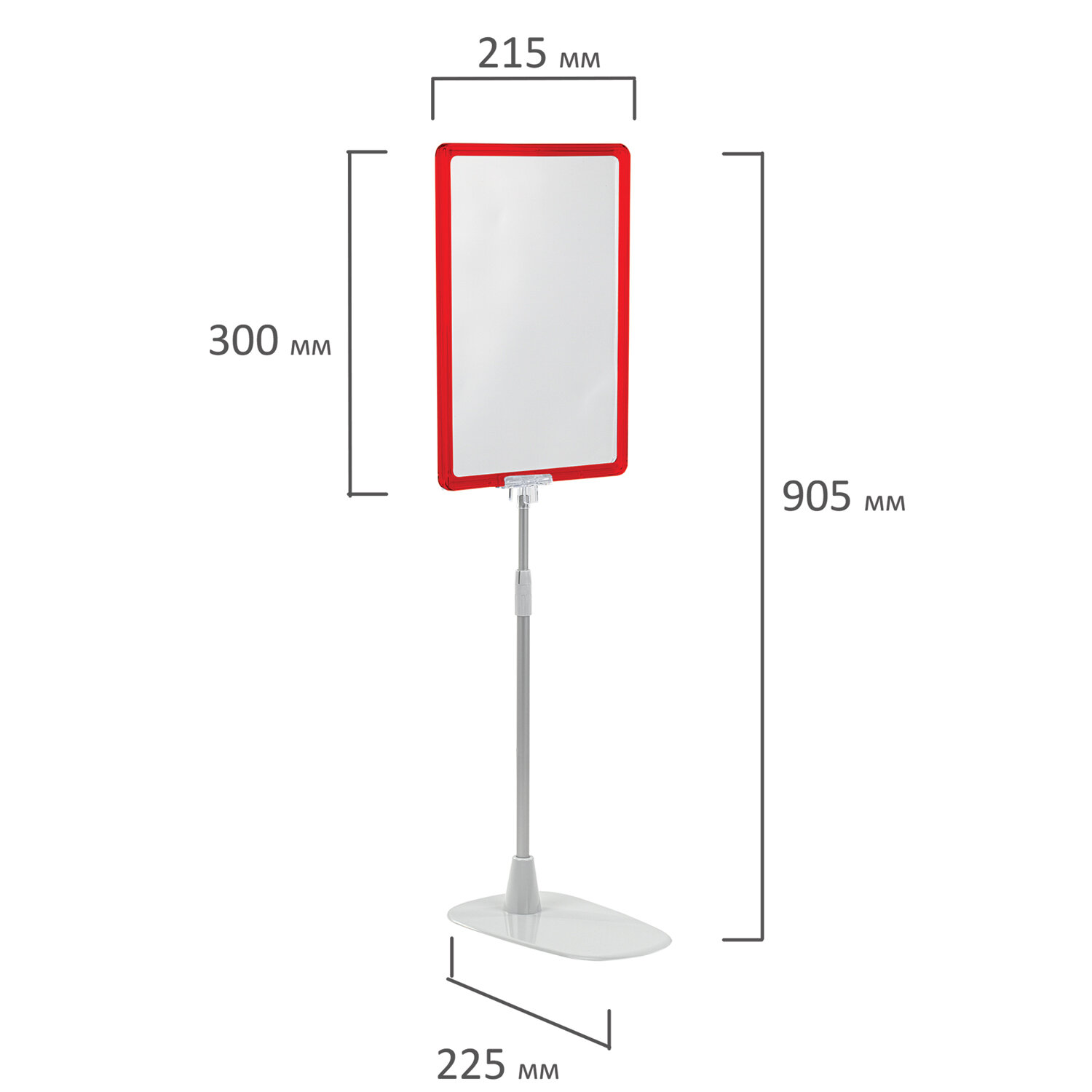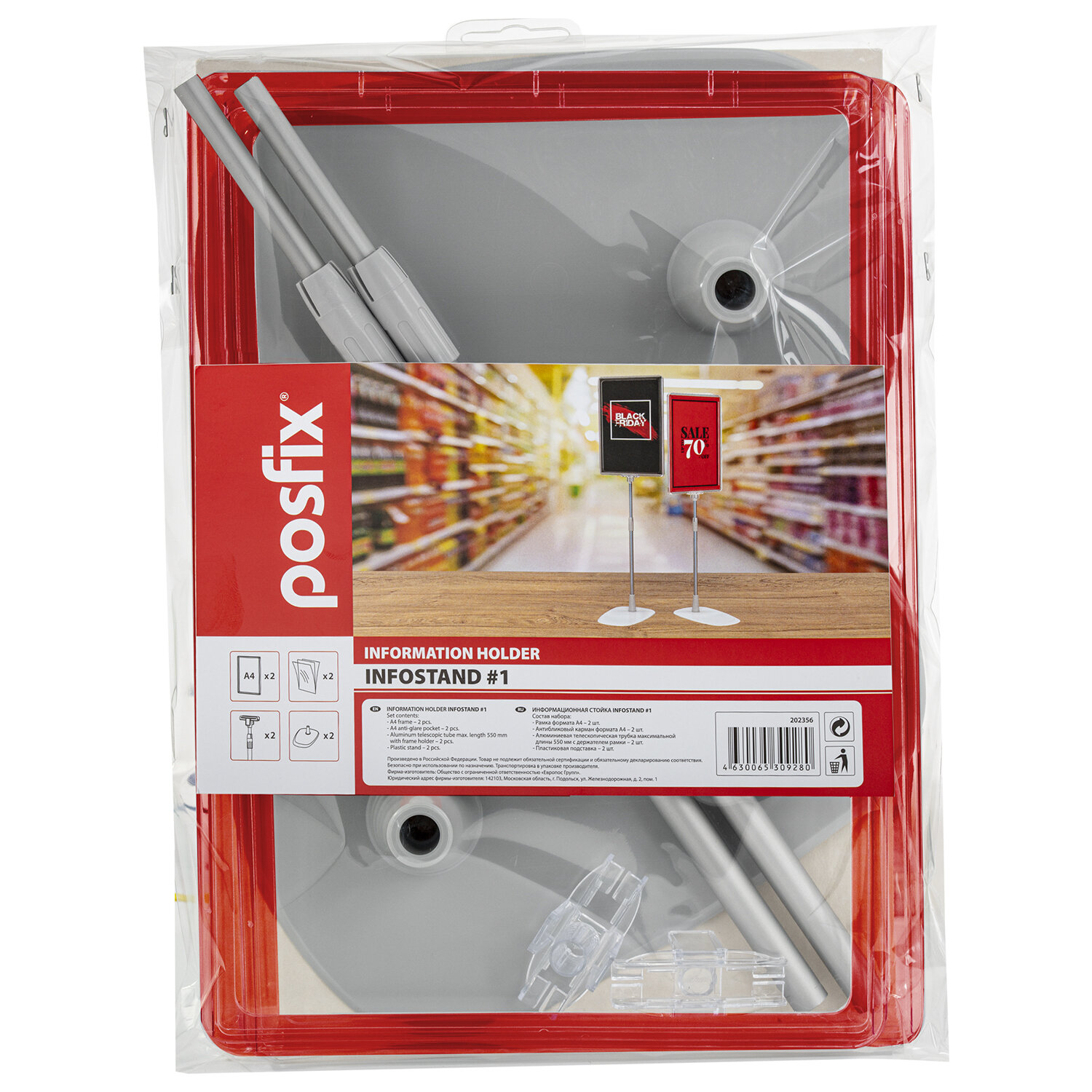 Набор включает в себя пластиковую рамку формата А4 красного цвета, антибликовый карман формата А4, алюминиевую телескопическую трубку с максимальной длиной 550 мм, держатель рамки, пластиковую подставку серого цвета. С помощью данного готового решения можно разместить информацию в различных заведениях: ресторанах, кафе, кондитерских, кофейнях, офисах продаж, магазинах.