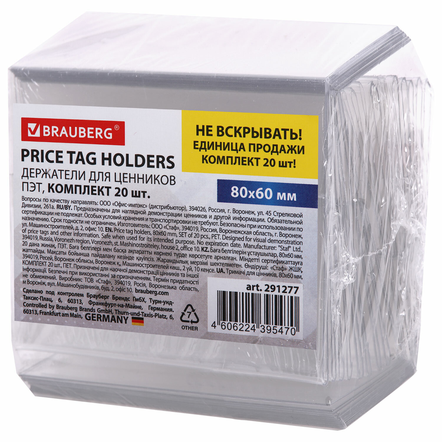 - Держатели для ценников, 80х60 мм, КОМПЛЕКТ 20 шт., ПЭТ, 0,5 мм, BRAUBERG, 291277