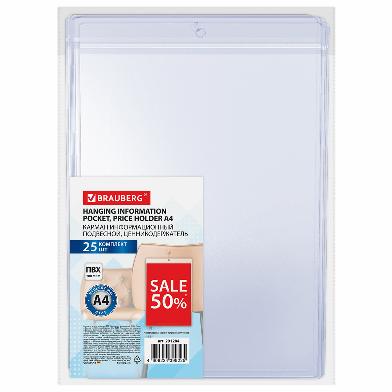 - Карман информационный подвесной, ценникодержатель А4, КОМПЛЕКТ 25 шт., ПВХ, BRAUBERG, 291284
