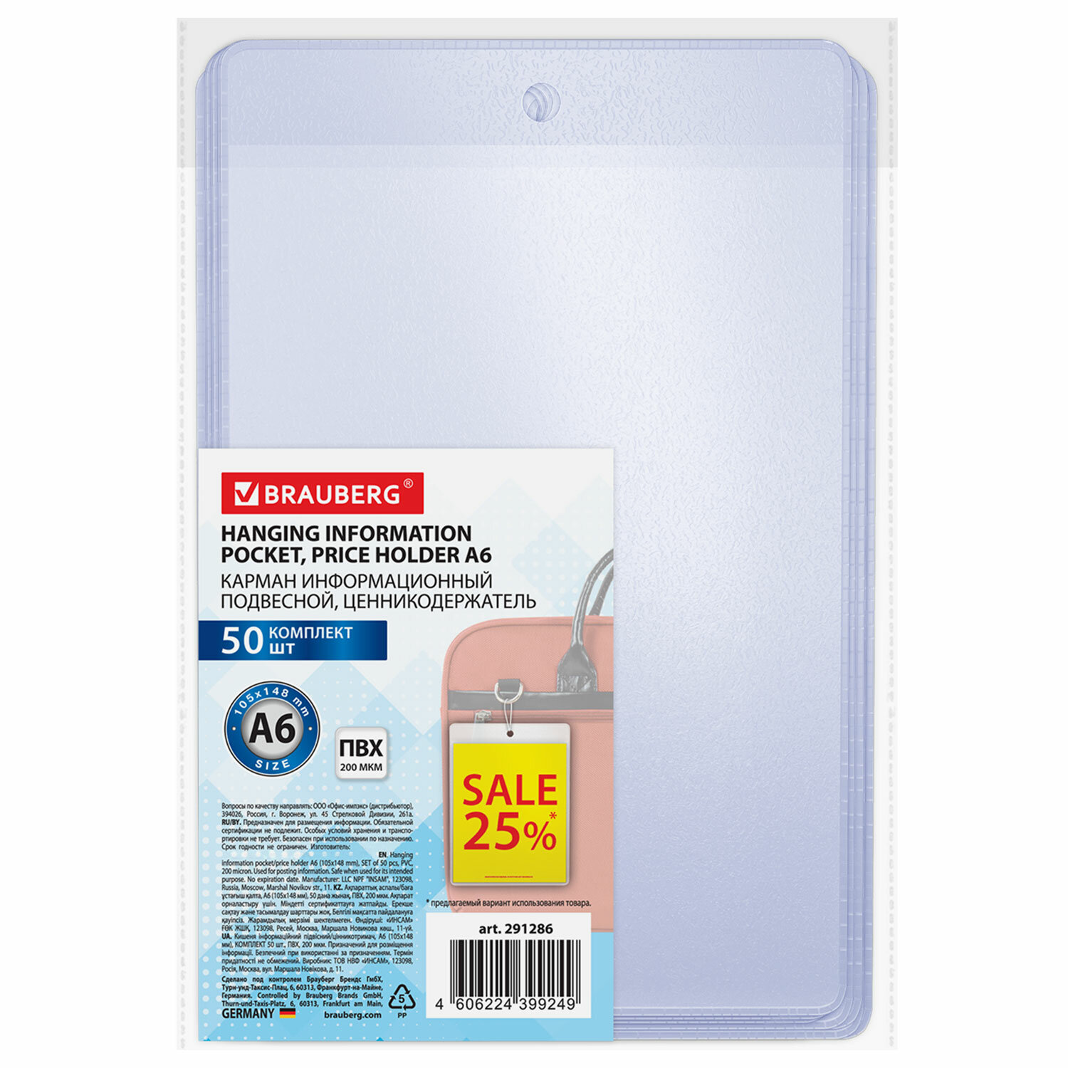 - Карман информационный подвесной, ценникодержатель А6, КОМПЛЕКТ 50 шт., ПВХ, BRAUBERG, 291286