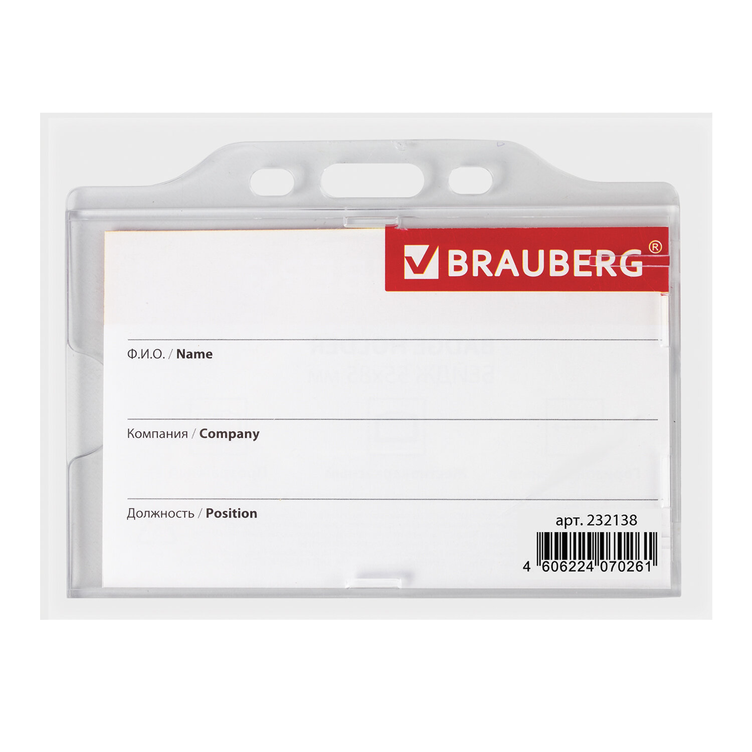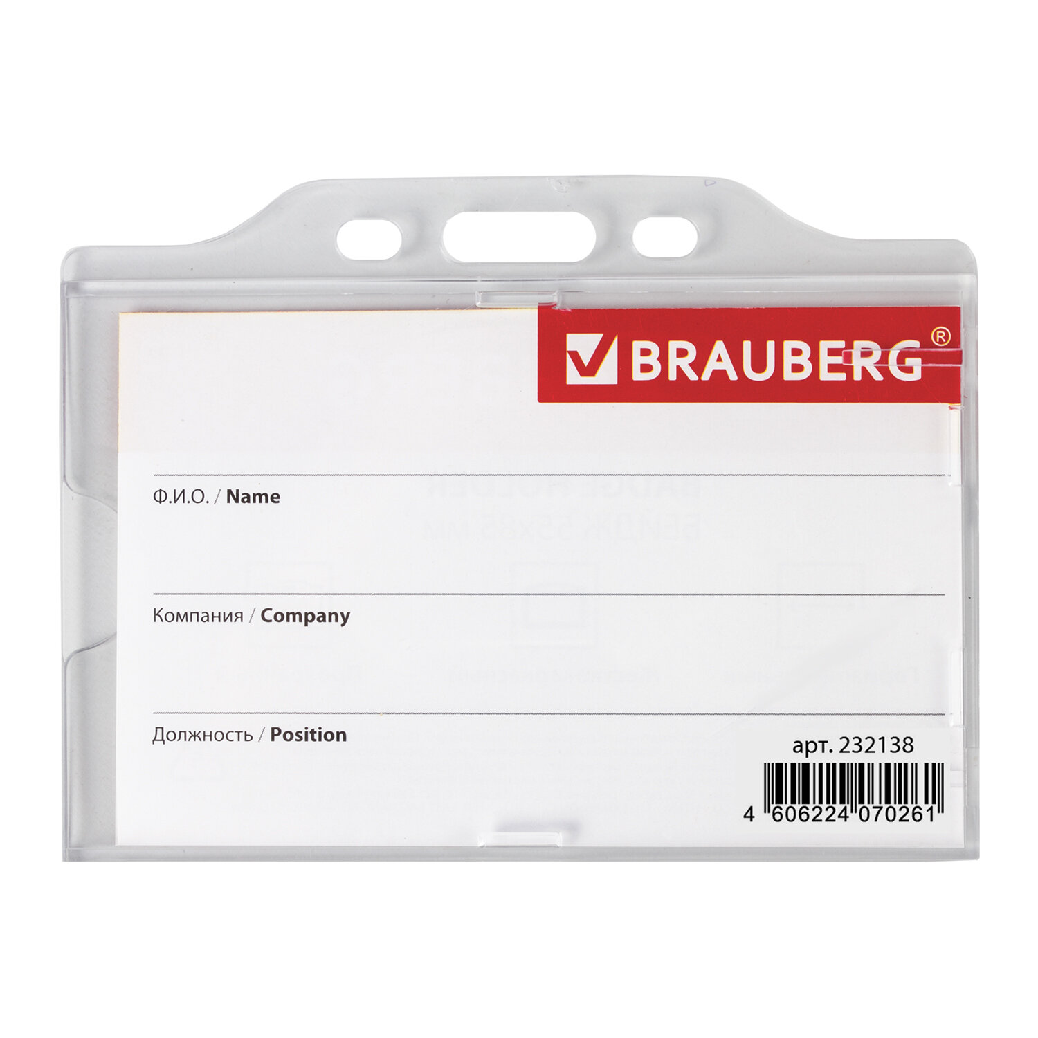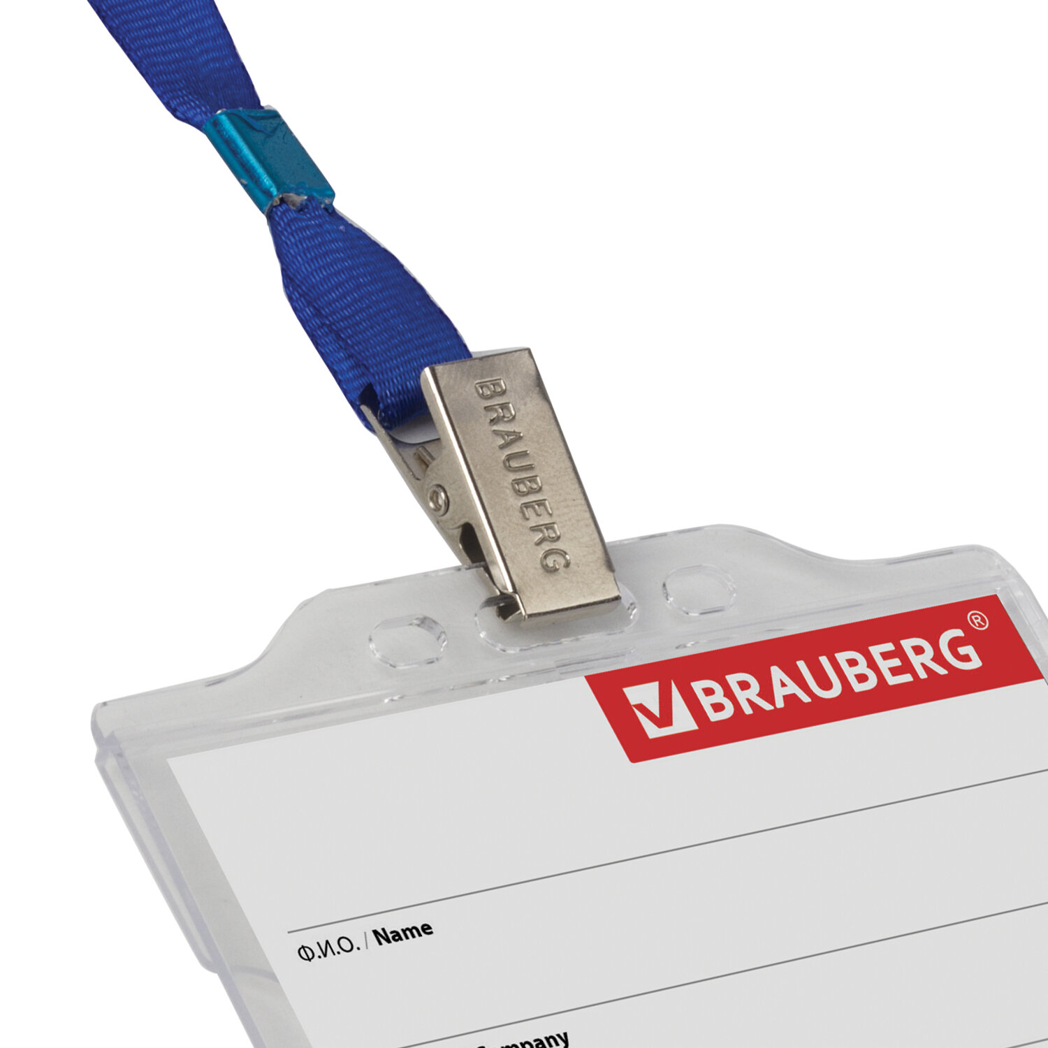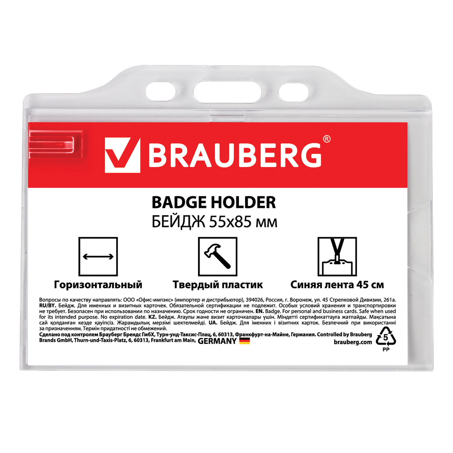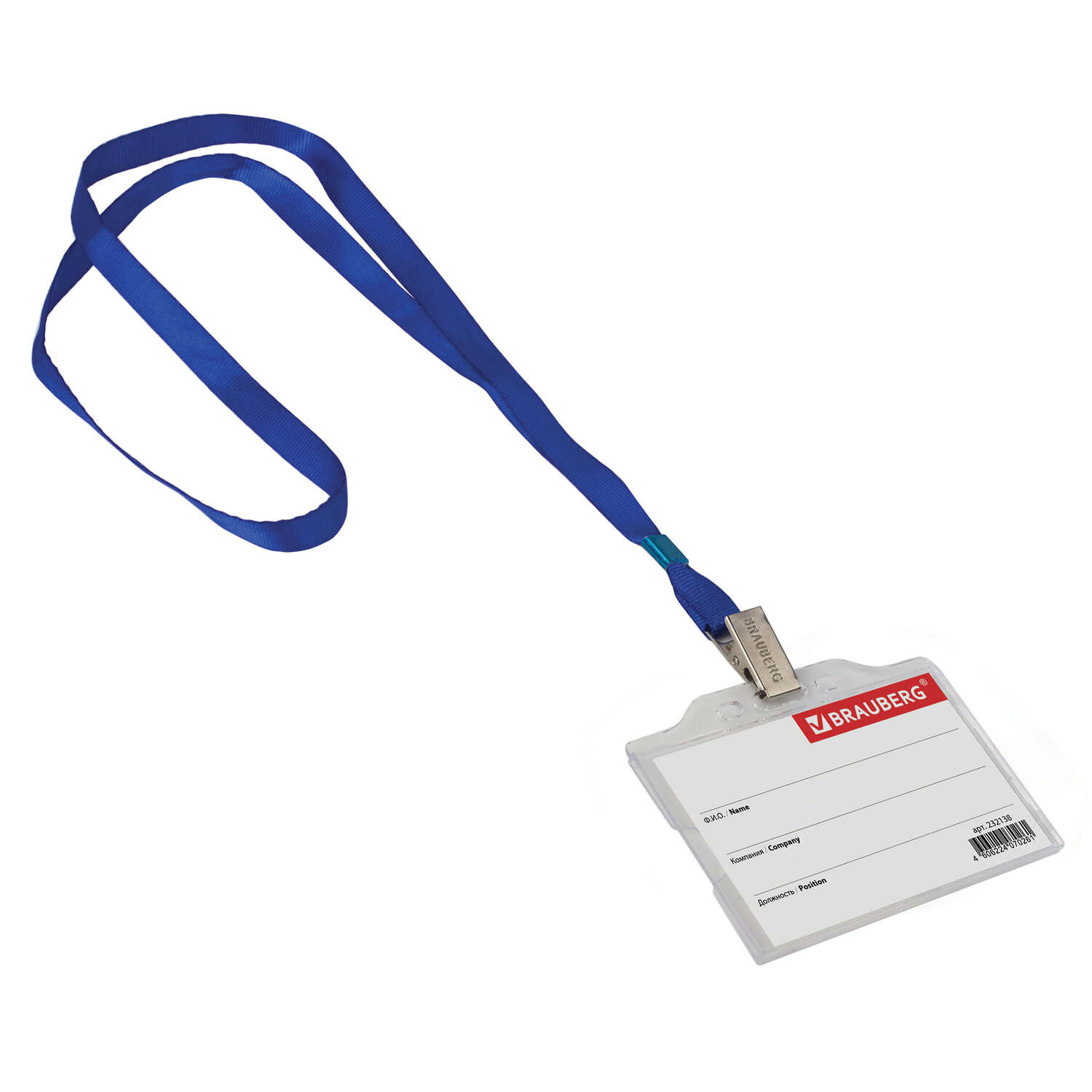 - Бейдж горизонтальный (55х85 мм), на синей ленте 45 см, твердый пластик, BRAUBERG, 232138