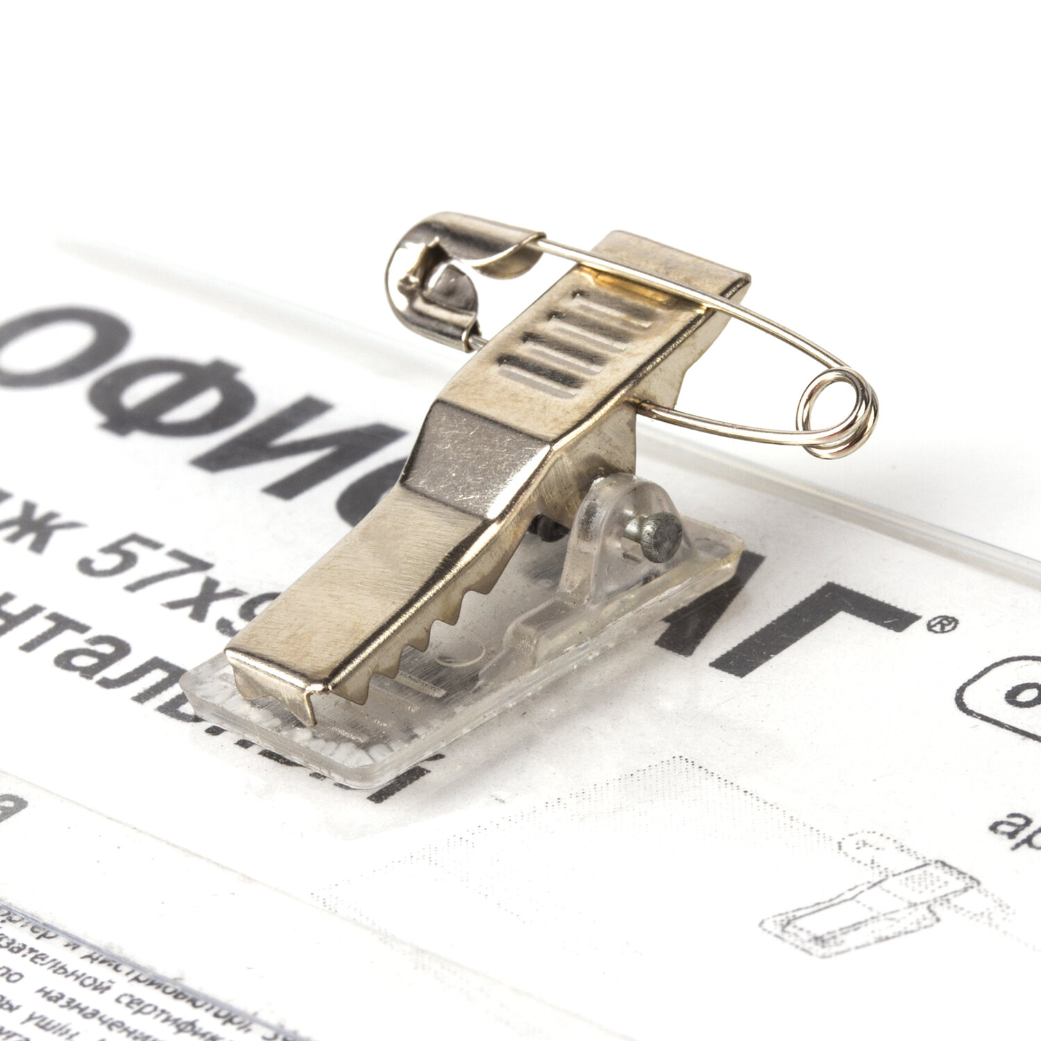 - Бейдж горизонтальный (57х90 мм), с клипсой и булавкой, жесткий, ОФИСМАГ, 235376
