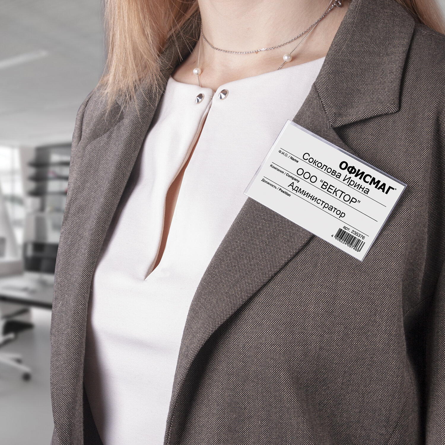 Маленькая карточка с именем, фамилией и должностью или другим статусом; крепится к одежде на видном месте, с первых минут знакомства помогает наладить коммуникации между людьми. Закрепляется на одежде при помощи клипсы или булавки. Размер вкладыша 90х57 мм. Бейдж горизонтальный (57х90 мм), с клипсой и булавкой, жесткий, ОФИСМАГ, 235376