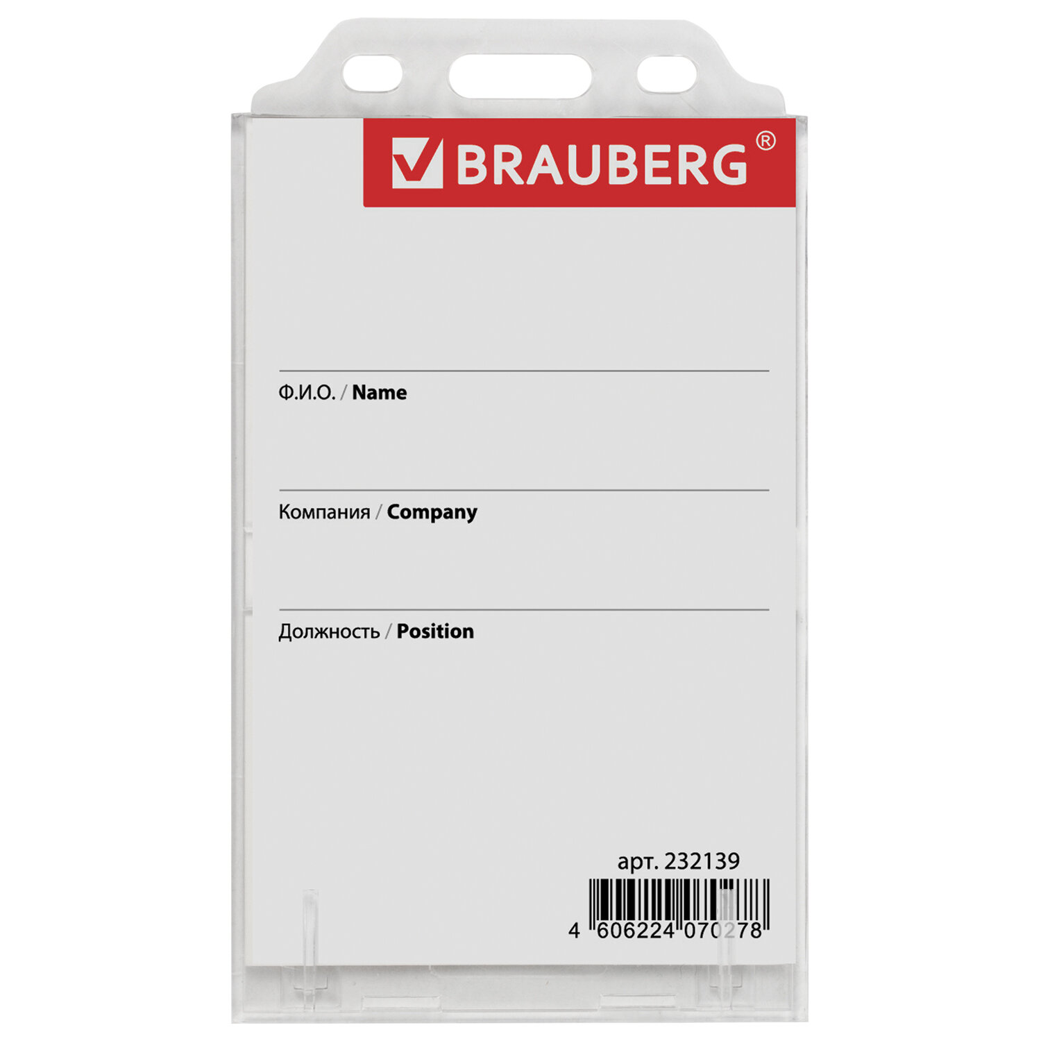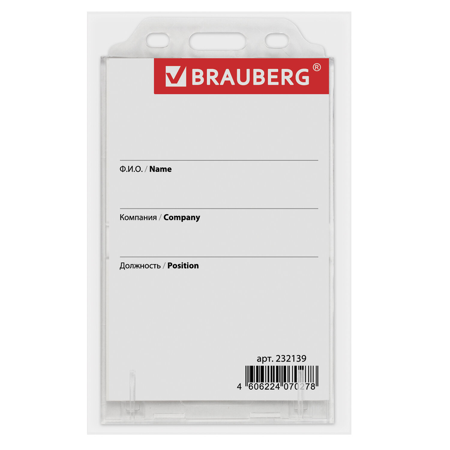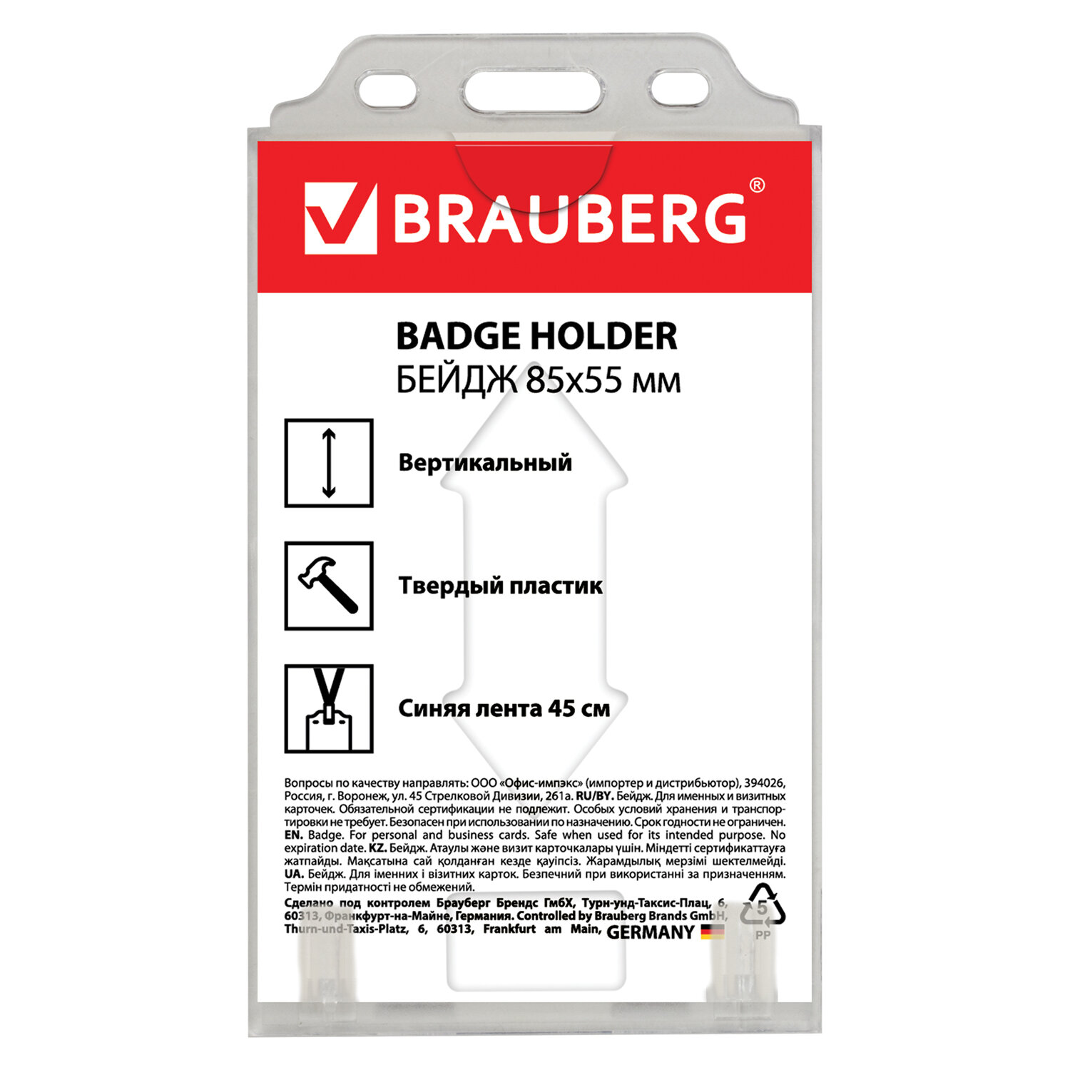 - Бейдж вертикальный (85х55 мм), на синей ленте 45 см, твердый пластик, BRAUBERG, 232139