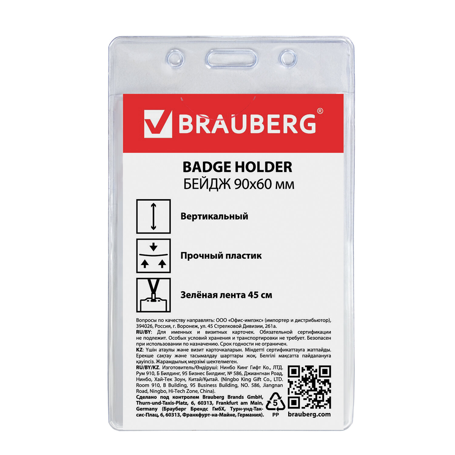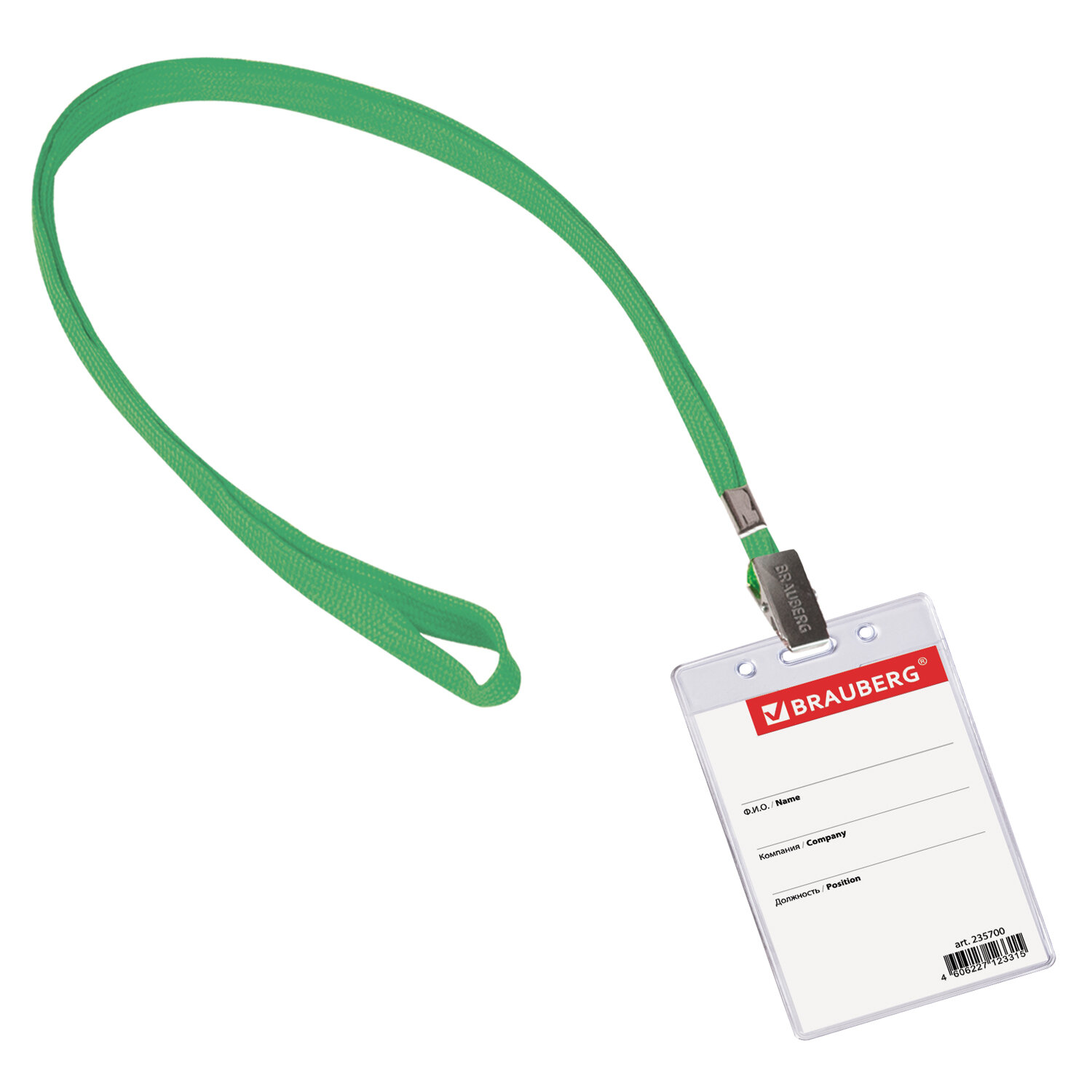 - Бейдж вертикальный (90х60 мм), на зеленой ленте 45 см, BRAUBERG, 235700