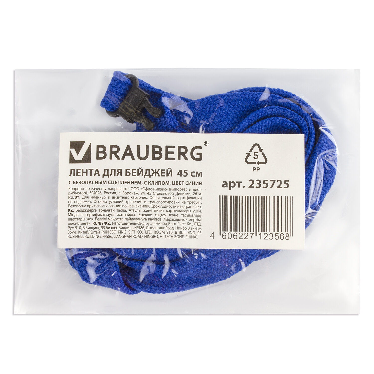 - Лента для бейджей, 45 см, с безопасным сцеплением, с клипом, СИНЯЯ, BRAUBERG, 235725