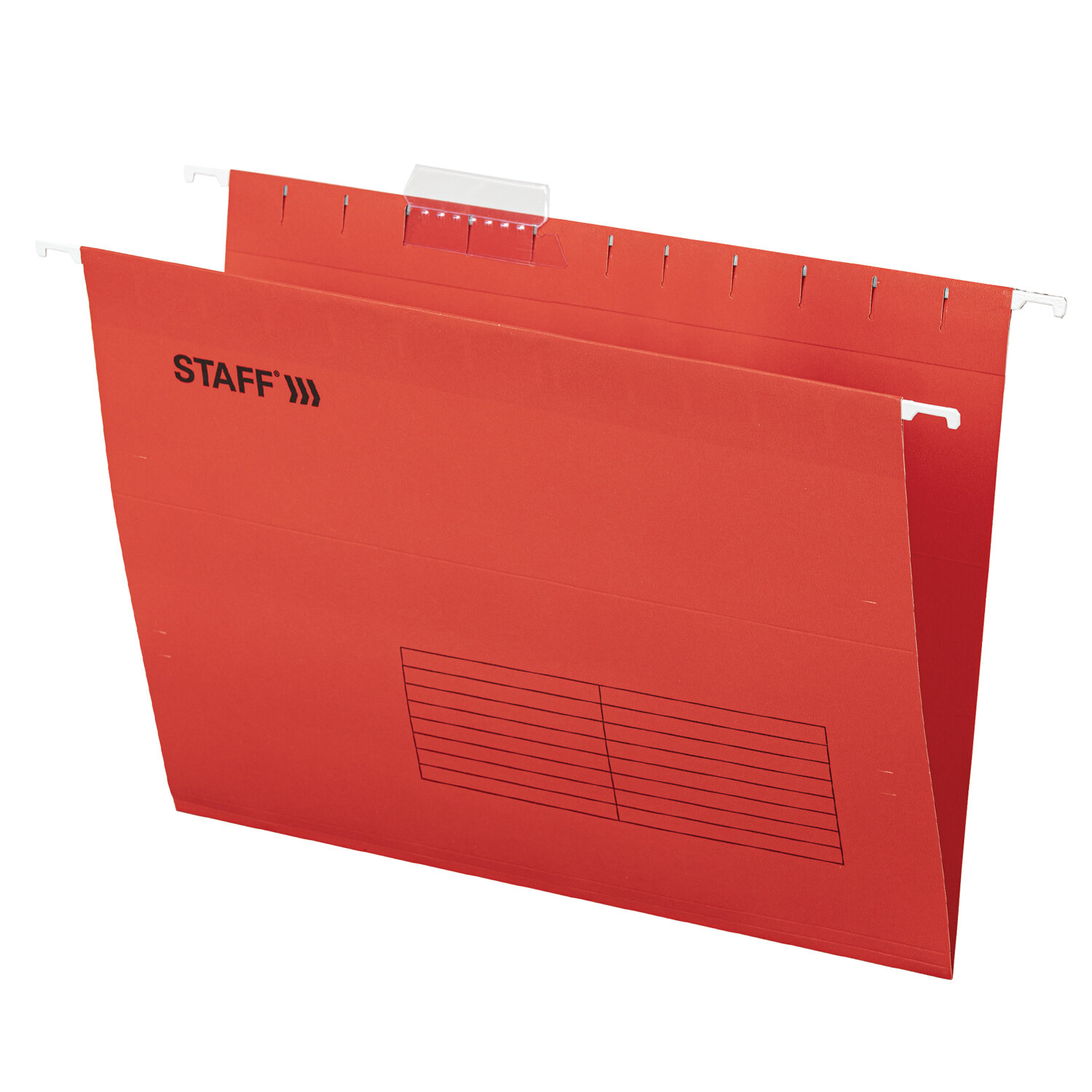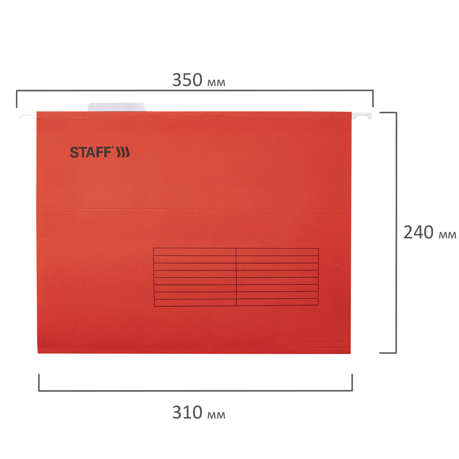 Папки V-образной формы изготовлены из высококачественного картона красного цвета плотностью 195 г/м2 и металлических крючков. Обладают повышенной прочностью. Вместимость до 80 листов. Размер папки без крючков составляет 310х240 мм, а с крючками - 350х240 мм. В комплект входят 10 папок, а также 10 прозрачных пластиковых табуляторов с ярлычками. Подвесные папки А4 (350х240 мм) до 80 л., КОМПЛЕКТ 10 шт., красные, картон, STAFF, 270931