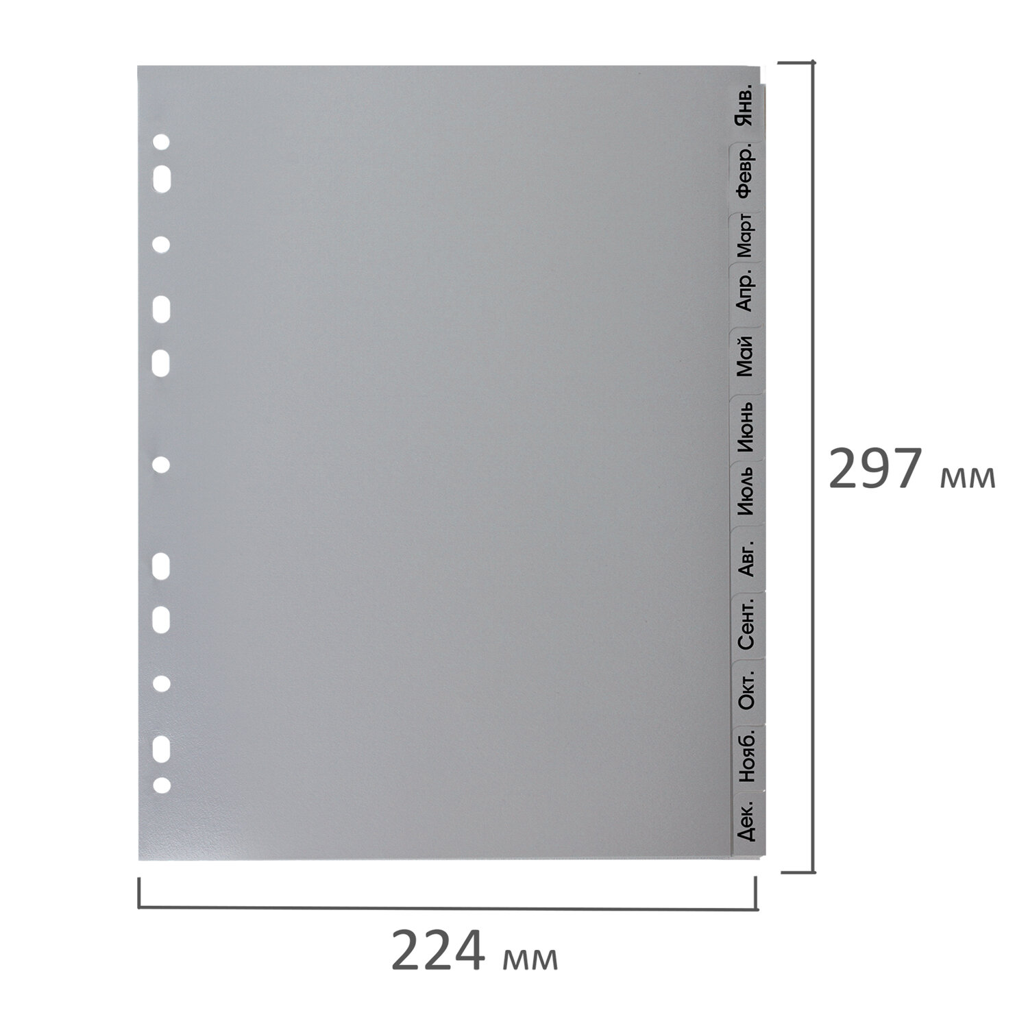 Изготовлены из пластика толщиной 0,12 мм. В комплект входят 12 листов серого цвета, обеспечивающих возможность сортировки документов по месяцам, а также титульный лист для оглавления. Универсальная перфорация позволяет подшивать разделители во все типы папок. Размер - 224х297 мм. Разделитель пластиковый BRAUBERG, А4, 12 листов, Январь-Декабрь, оглавление, серый, РОССИЯ, 225599