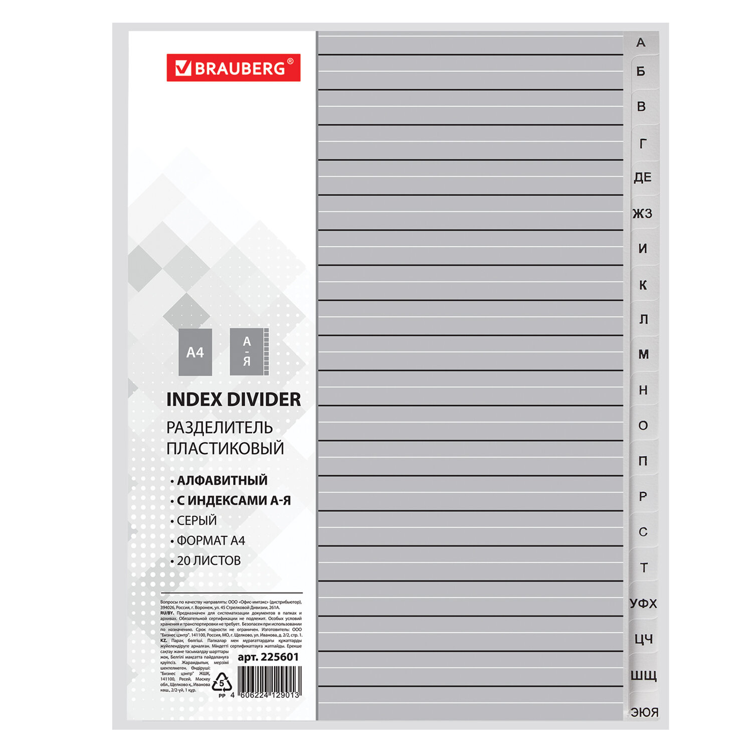 - Разделитель пластиковый BRAUBERG, А4, 20 листов, алфавитный А-Я, оглавление, серый, РОССИЯ, 225601