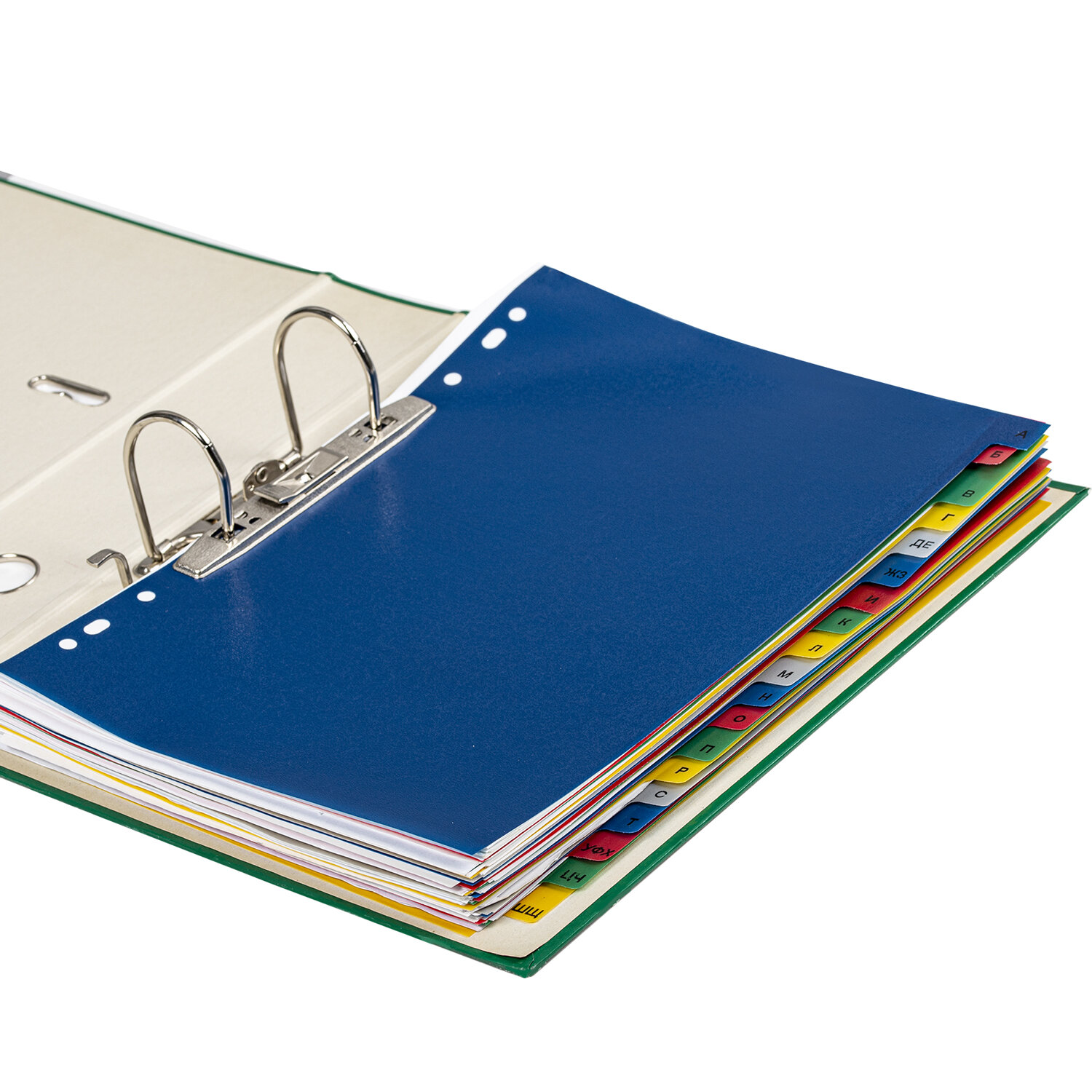 Изготовлены из пластика толщиной 0,12 мм. В комплект входят 20 листов синего, красного, серого, зеленого и желтого цвета, обеспечивающих возможность сортировки документов по алфавиту, а также титульный лист для оглавления. Универсальная перфорация позволяет подшивать разделители во все типы папок. Размер - 224х297 мм. Разделитель пластиковый BRAUBERG, А4, 20 листов, алфавитный А-Я, оглавление, цветной, РОССИЯ, 225615