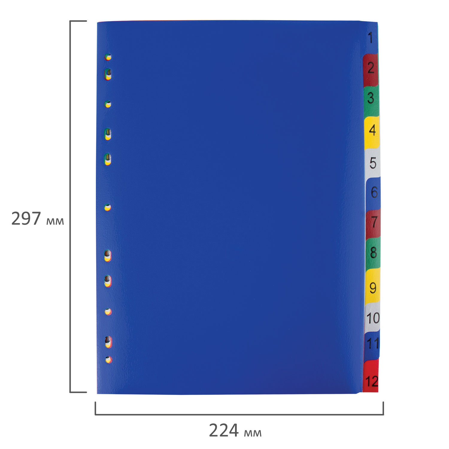 Изготовлены из пластика толщиной 0,12 мм. В комплект входят 12 листов синего, красного, серого, зеленого и желтого цвета, обеспечивающих возможность сортировки документов по цифрам, а также титульный лист для оглавления. Универсальная перфорация позволяет подшивать разделители во все типы папок. Размер - 224х297 мм. Разделитель пластиковый ОФИСМАГ, А4, 12 листов, цифровой 1-12, оглавление, цветной, РОССИЯ, 225617