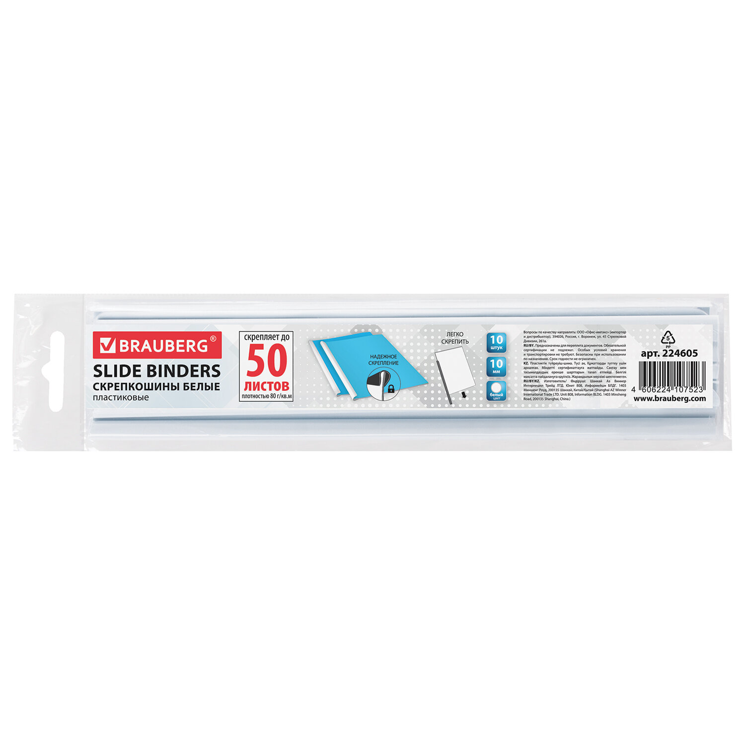 - Скрепкошины для быстрого переплета BRAUBERG, комплект 10 шт., ширина 10 мм (до 50 л. А4), белые, 224605
