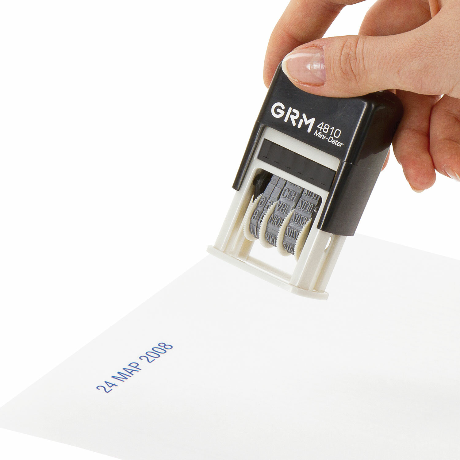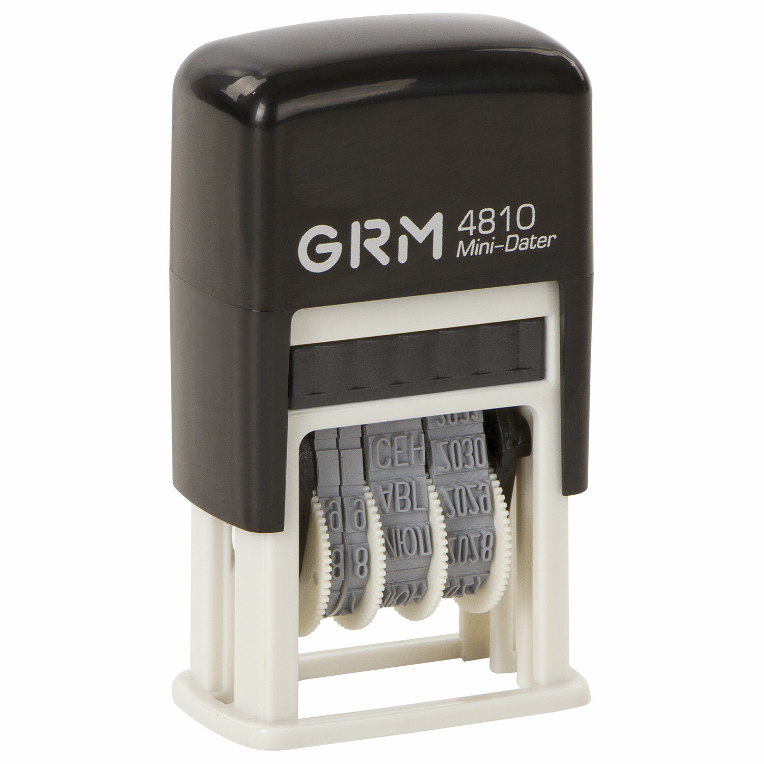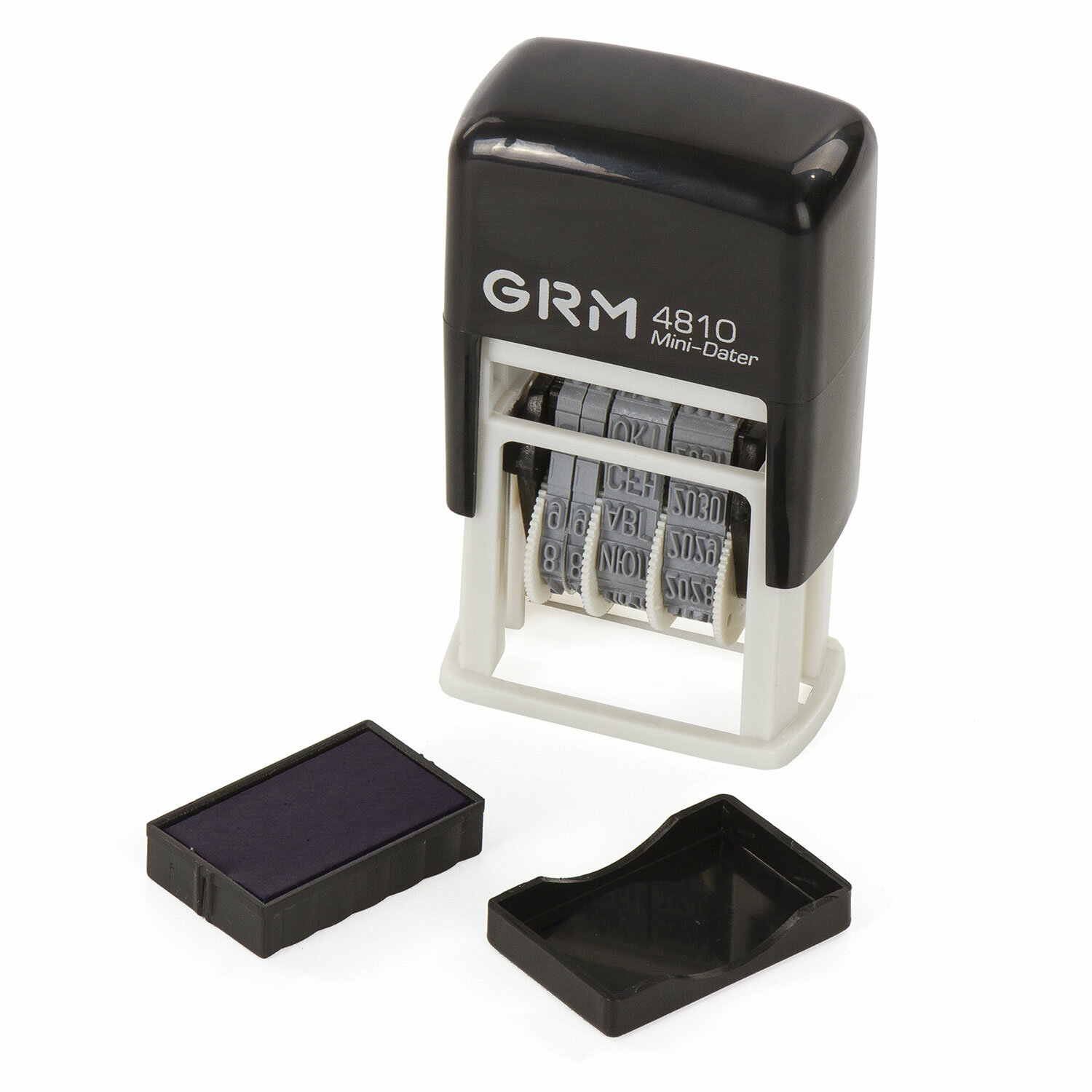 Мини-датер проставляет оттиск даты с указанием месяца буквами. Дата меняется вращением колесика. Часто используется для маркировки документов и сроков изготовления на товарах. Надежная конструкция обеспечивает до 50 000 оттисков. Датер-мини месяц буквами, оттиск 20х3,8 мм синий, GRM 4810, 124131000