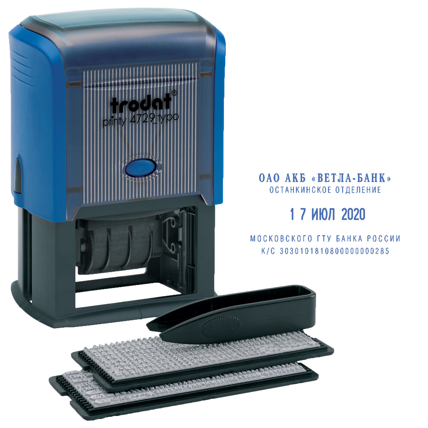 - Датер самонаборный, 4 строки+дата, оттиск 50х30 мм, синий, TRODAT 4729, кассы в комплекте, 53334