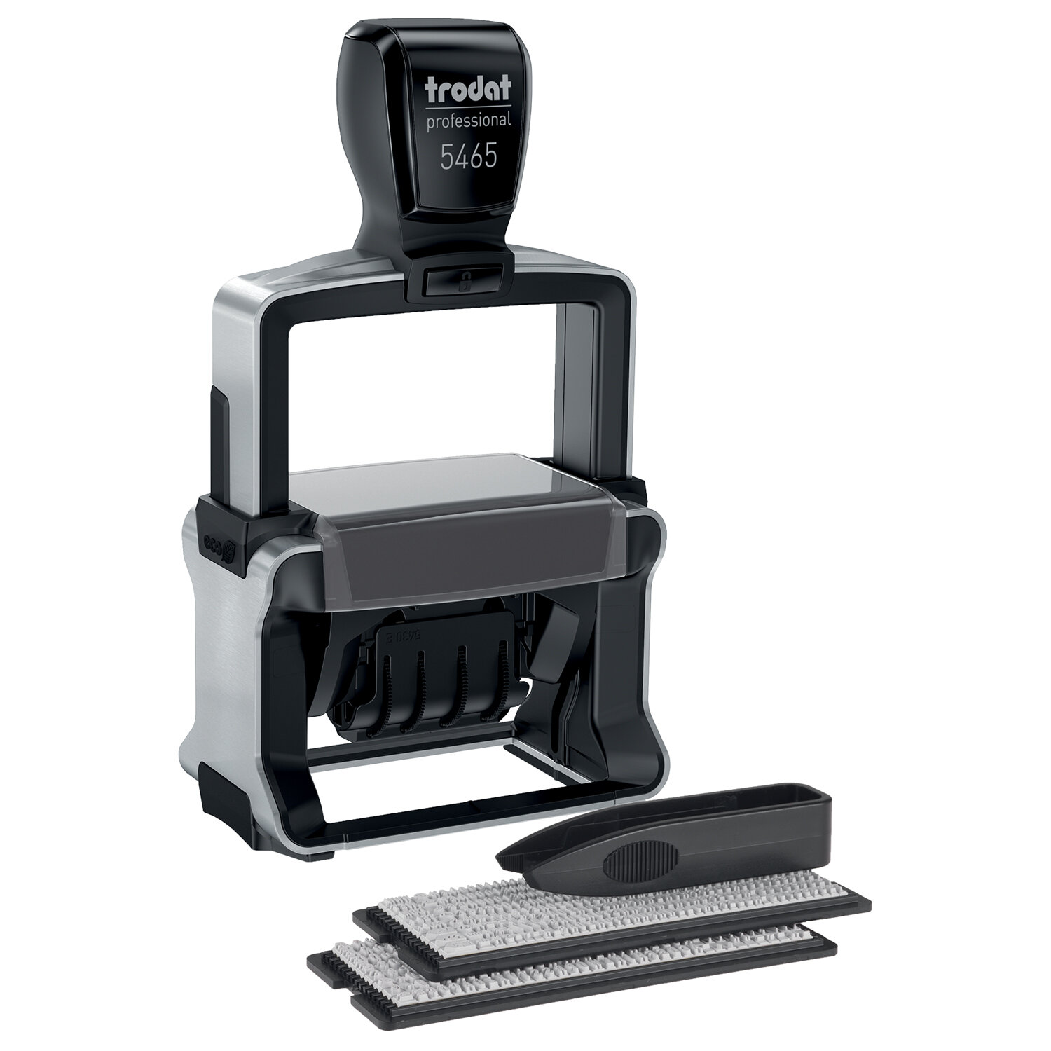 Датер с прочным металлическим каркасом и удобной рукояткой. Легкий и бесшумный в работе. Используется банками для оформления платежных поручений. Датер самонаборный металлический, 4 строки+дата, оттиск 56х33 мм, сине-красный, TRODAT 5465BANK, кассы в комплекте, 62166