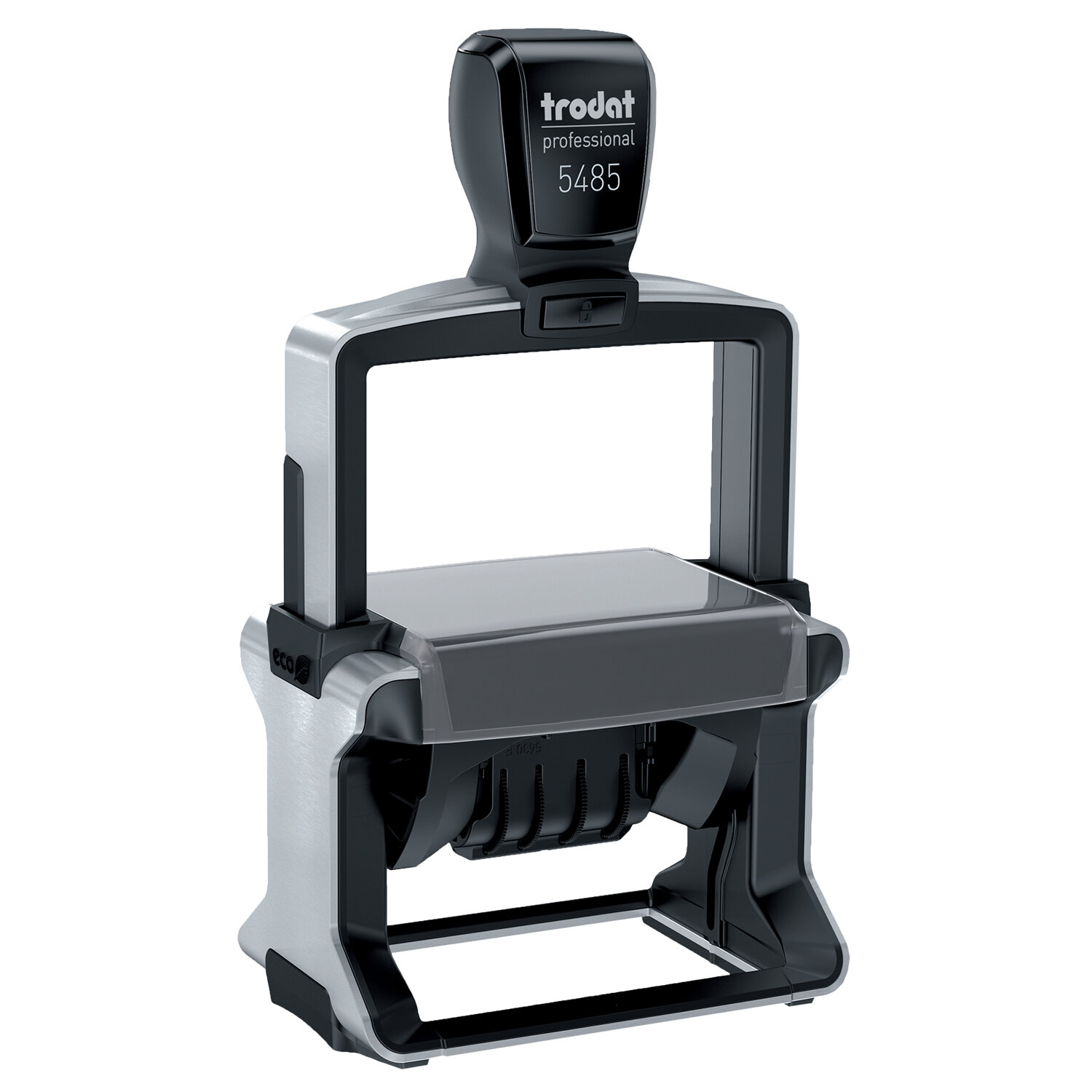 Датер с прочным металлическим каркасом и удобной рукояткой. Легкий и бесшумный в работе. Рекомендуется для крупных организаций, таможни, банков, государственных структур. Датер самонаборный металлический, 6 строк+дата, деление точка, оттиск 68х47 мм, сине-красный, TRODAT 5485BANK, кассы, 62163