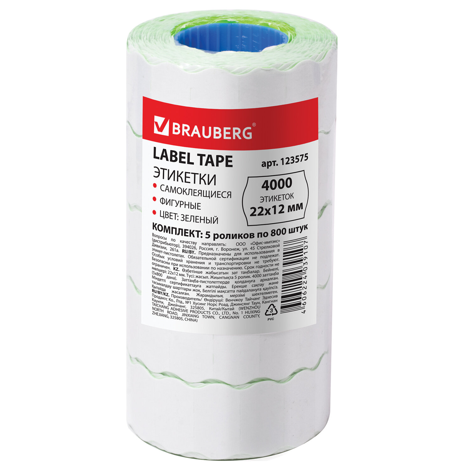 - Этикет-лента 22х12 мм, волна, зеленая, комплект 5 рулонов по 800 шт., BRAUBERG, 123575