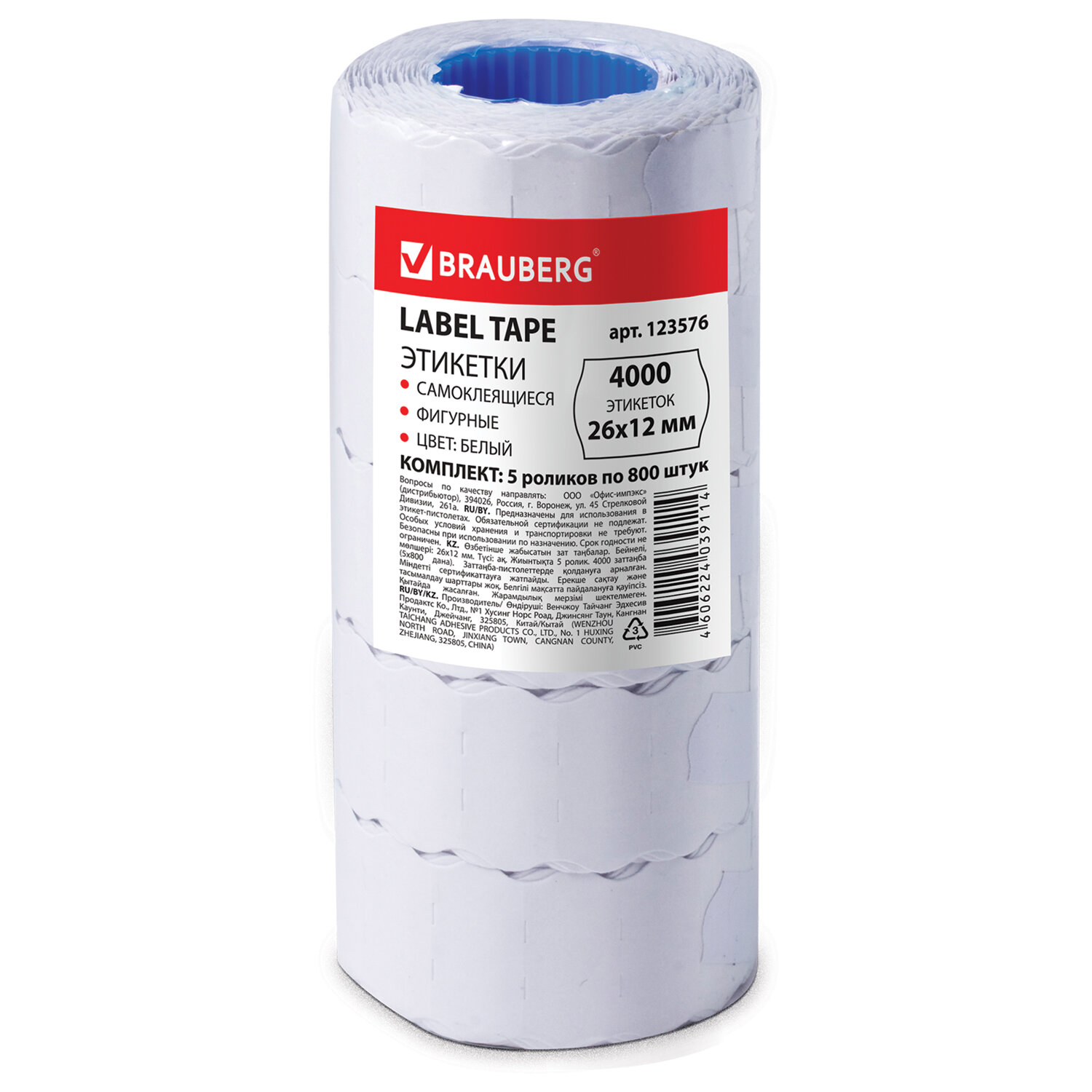 - Этикет-лента 26х12 мм, волна, белая, комплект 5 рулонов по 800 шт., BRAUBERG, 123576