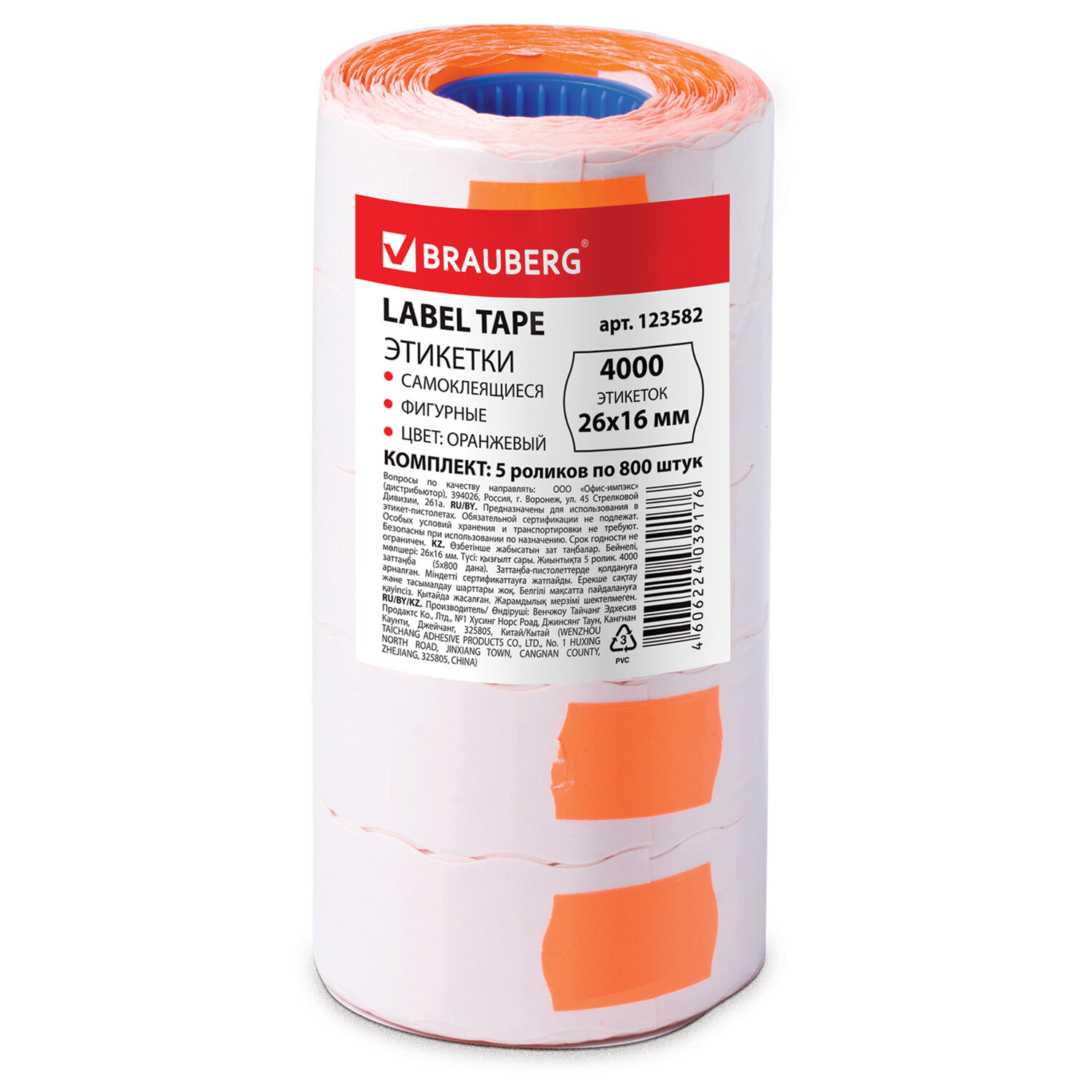 - Этикет-лента 26х16 мм, волна, оранжевая, комплект 5 рулонов по 800 шт., BRAUBERG, 123582