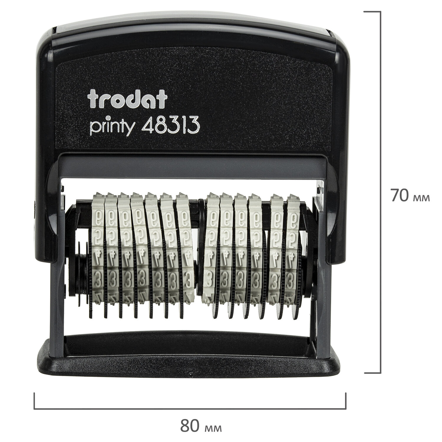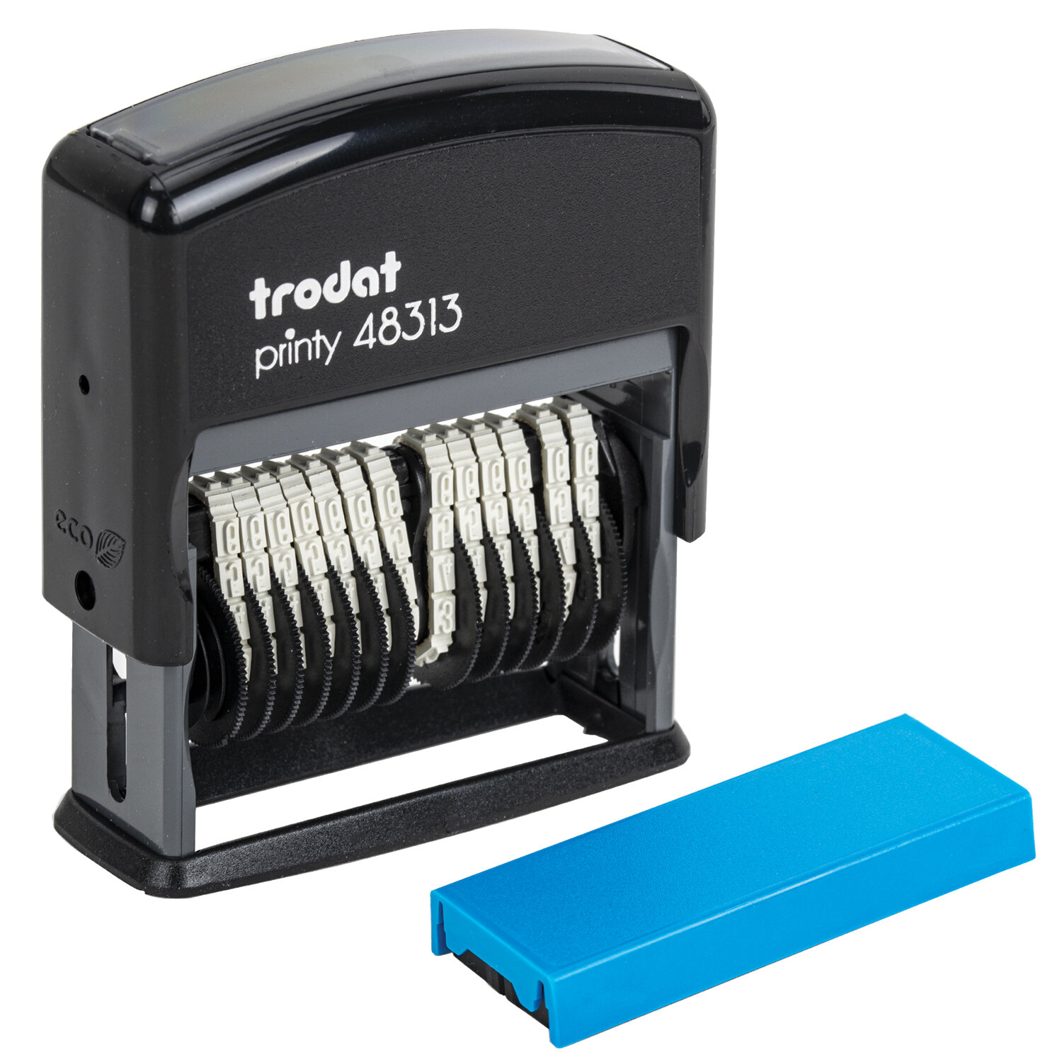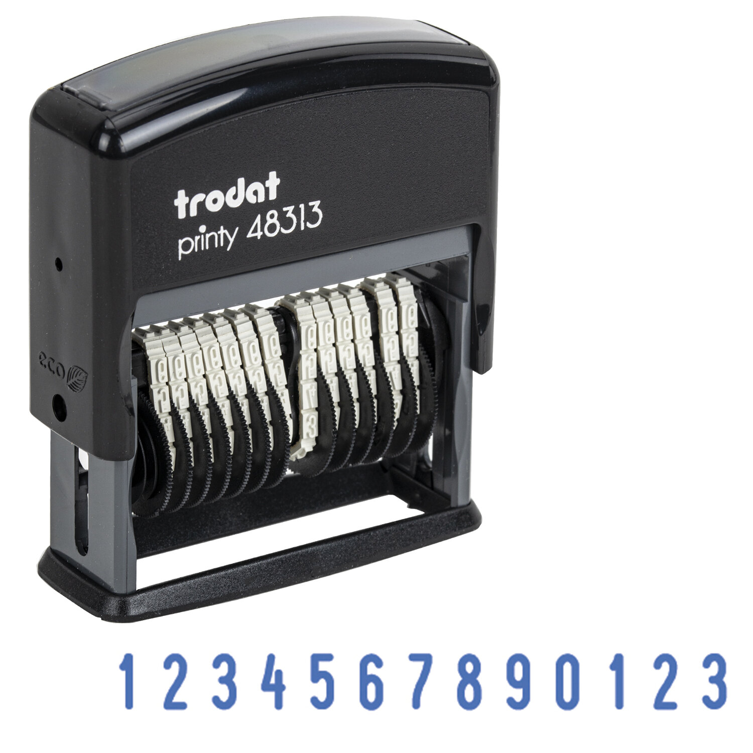 Тринадцатиразрядный нумератор позволяет проставить одинаковый номер на нескольких экземплярах документа или товара. Смена номера производится вращением колесика. Нумератор 13-разрядный, оттиск 42х3,8 мм, синий, TRODAT 48313, корпус черный, 53198