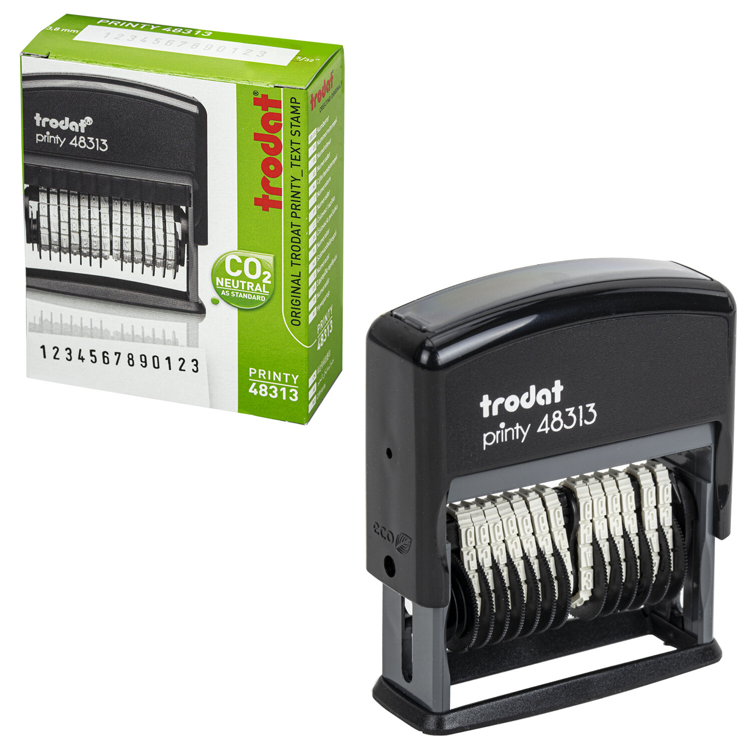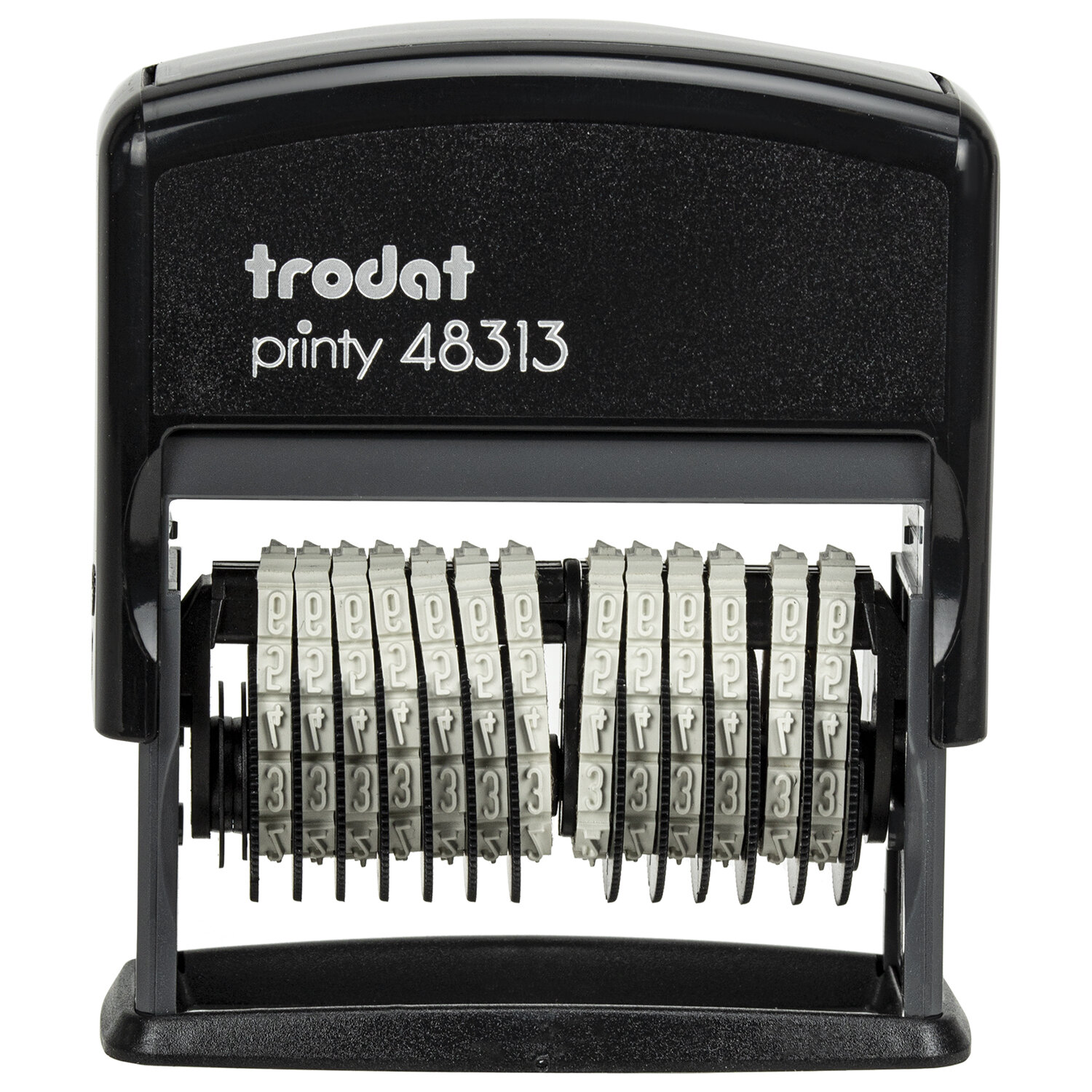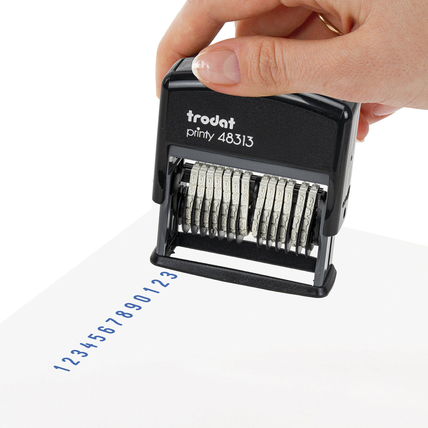 Тринадцатиразрядный нумератор позволяет проставить одинаковый номер на нескольких экземплярах документа или товара. Смена номера производится вращением колесика. Нумератор 13-разрядный, оттиск 42х3,8 мм, синий, TRODAT 48313, корпус черный, 53198