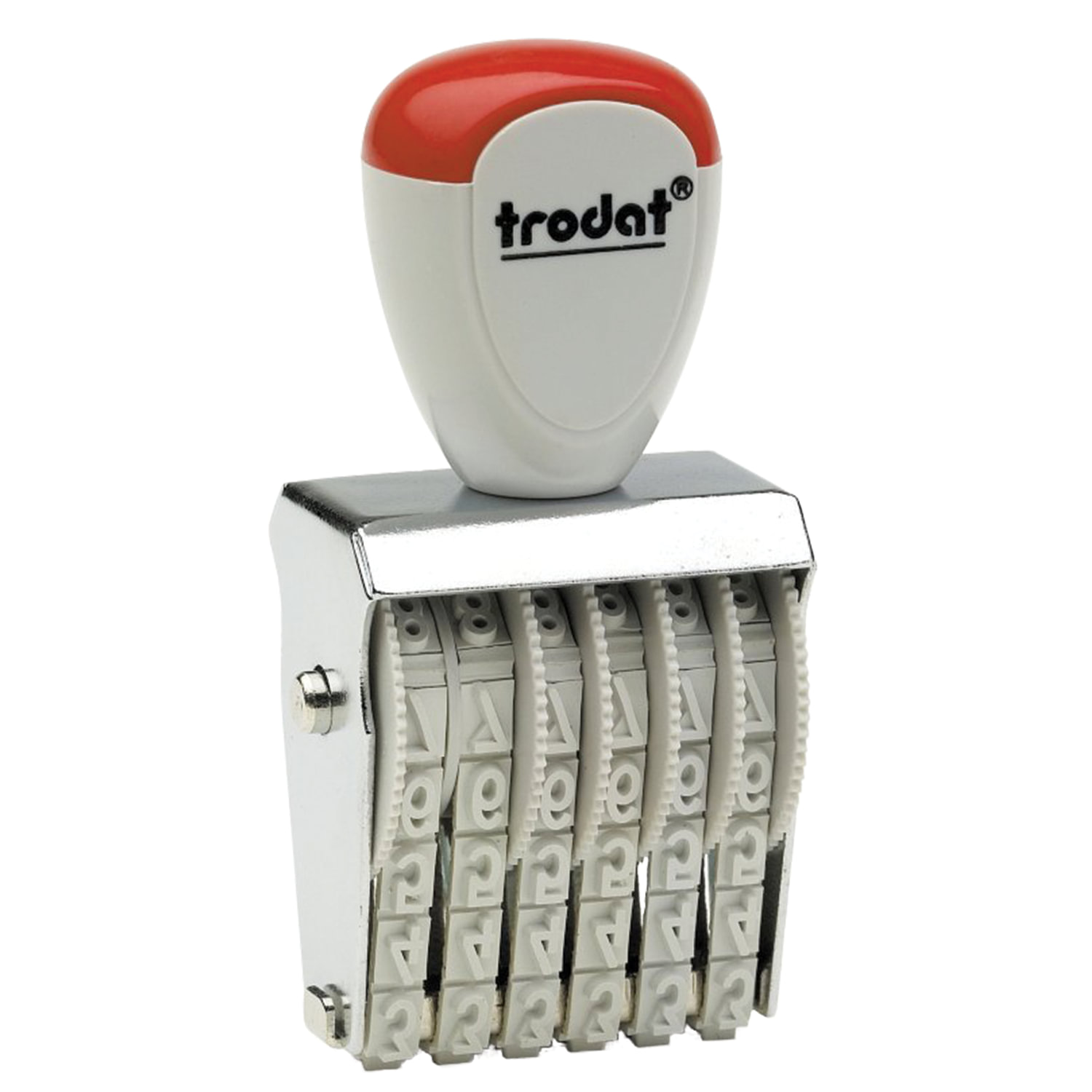 Окрашивание нумератора производится вручную через обмакивание в настольную штемпельную подушку. Допускается использование со специальными штемпельными красками на спиртовой основе. Удобная, простая и надежная конструкция прослужит длительное время, будет надежным помощником в работе. Нумератор ручной ленточный, 6 разрядов, оттиск 27х4 мм, TRODAT 1556, 54886
