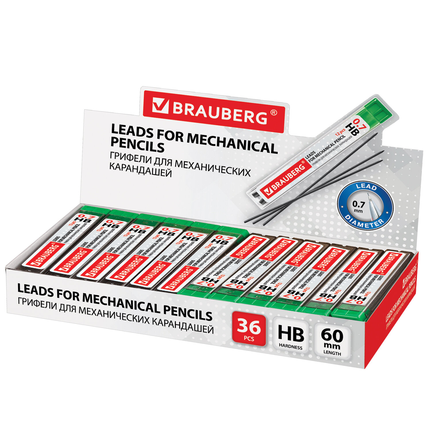 Изготовлены из высококачественных полимерных материалов, обеспечивающих мягкое письмо. Устойчивы к излому. Обладают средней степенью твердости – HB. Длина грифеля составляет 60 мм, а его диаметр - 0,7 мм. 12 штук в упаковке. Поставляются в пластиковом пенале. Грифели запасные 0,7 мм, HB, BRAUBERG, КОМПЛЕКТ 12 шт., "Hi-Polymer", 180446