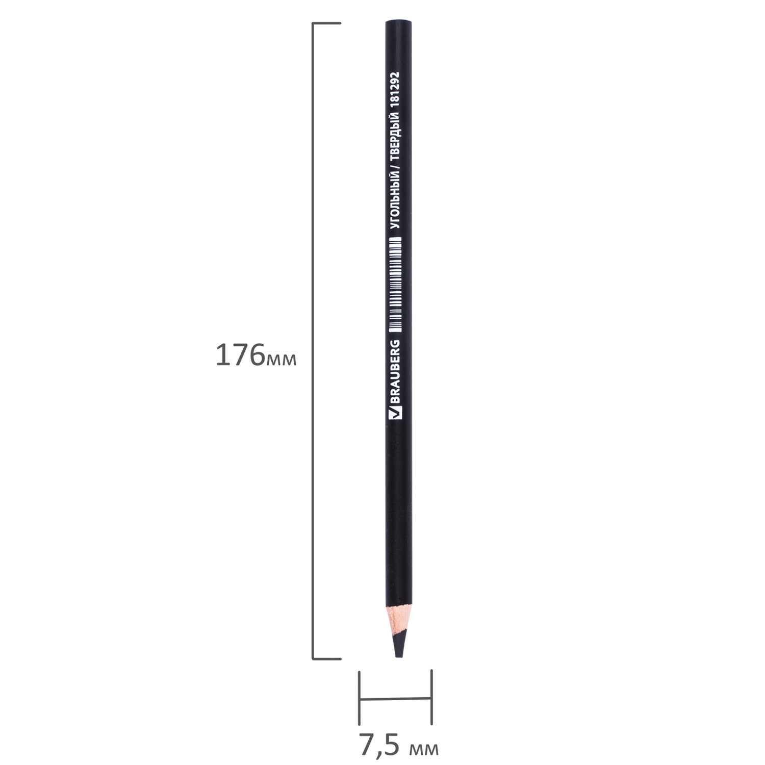 Корпус длиной 176 мм и диаметром 7,5 мм изготовлен из натуральной липы. Заточенный карандаш черного цвета универсален в рисовании и обладает огромными возможностями в передаче света и тени. Обладает высокой степенью твердости (HARD). Диаметр грифеля - 4 мм. Поставляется в количестве 12 штук в картонной коробке. Карандаш (1 штука) угольный BRAUBERG ART CLASSIC, ТВЕРДЫЙ, круглый, корпус черный, заточенный, 181292