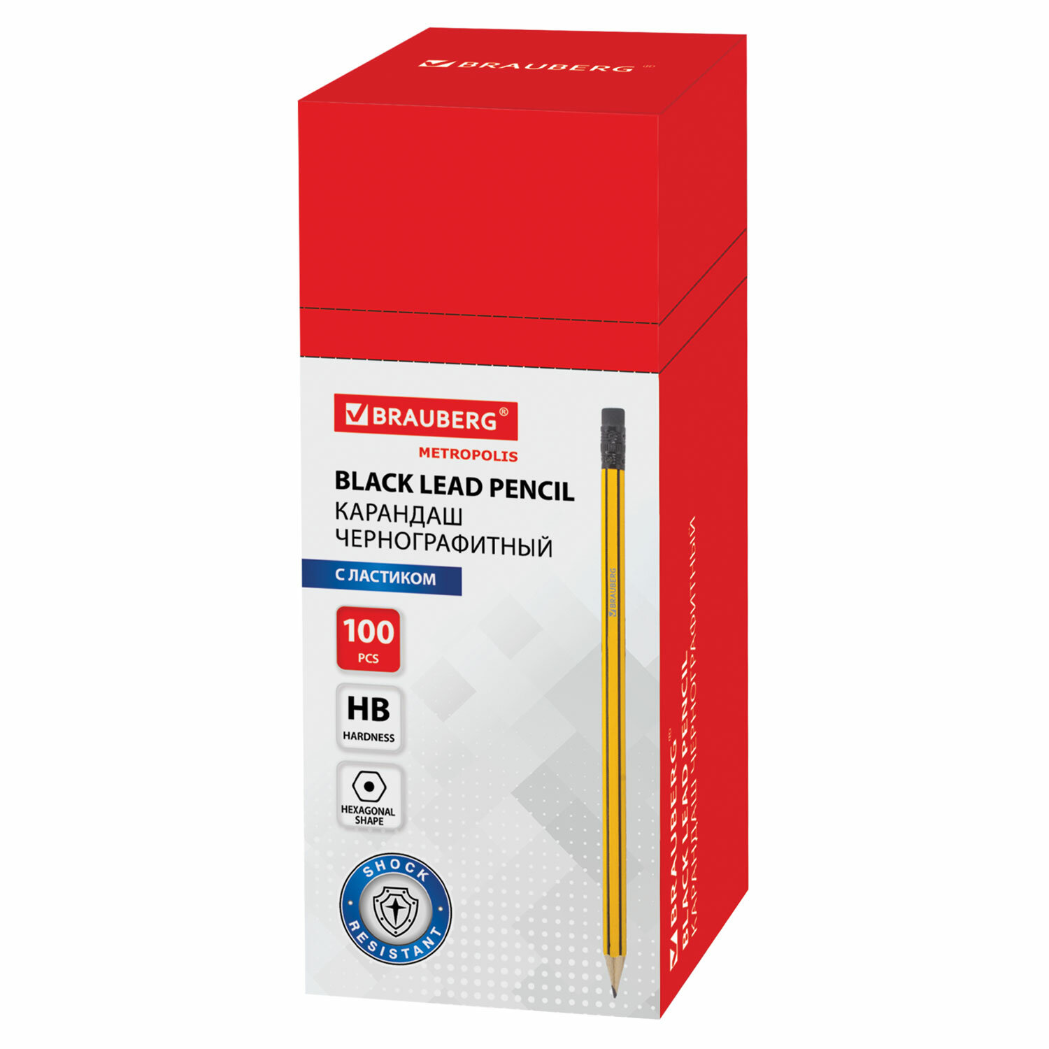 - Карандаш чернографитный BRAUBERG, 1 шт., НВ, с ластиком, корпус желтый с черными полосами, заточенный, 180614