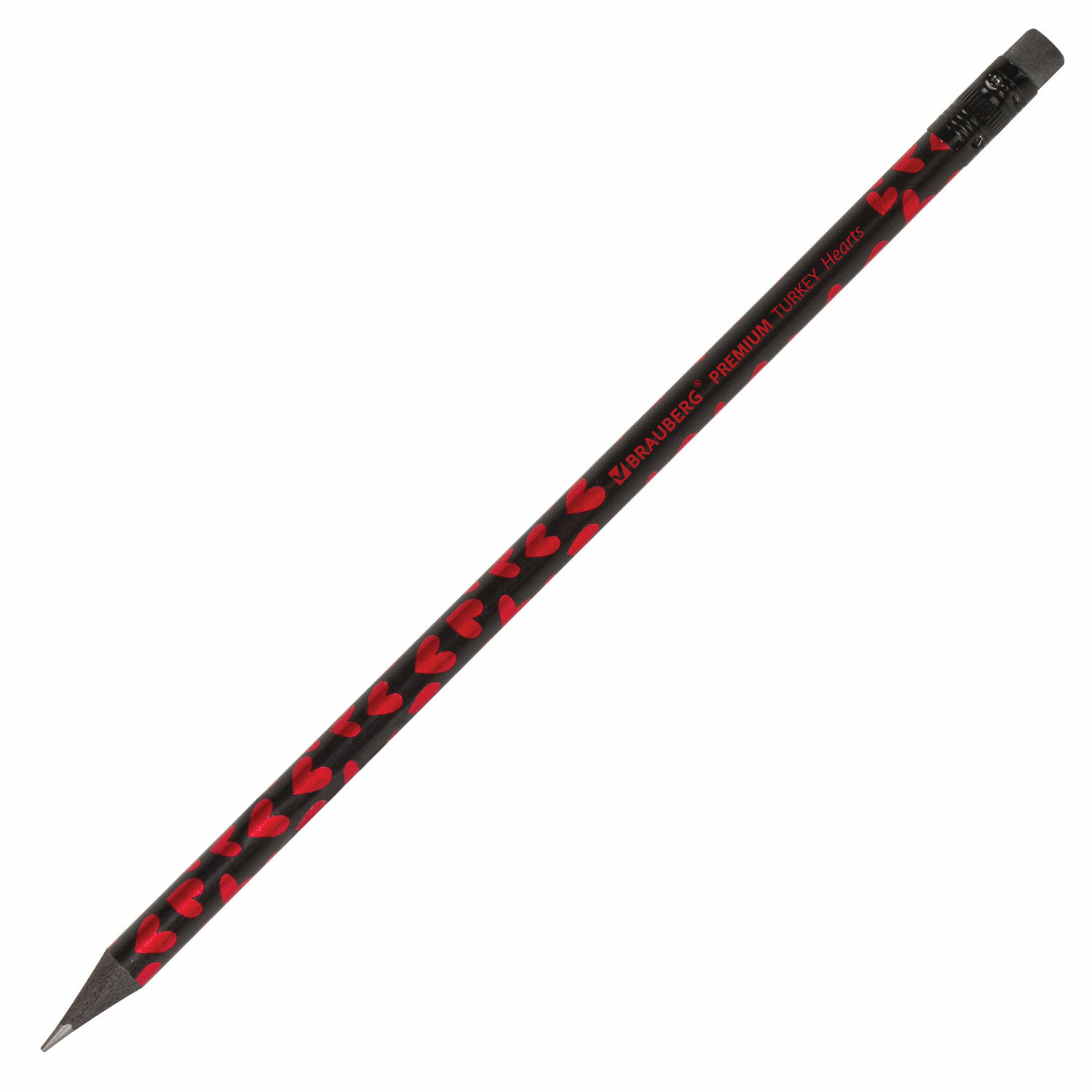 Каждый карандаш имеет индивидуальный штрих-код. Легко затачивается, максимально устойчив к повреждениям. Изготовлен из чёрного дерева высокого качества, оснащен ластиком. Имеет круглое сечение. Карандаш длиной 190 мм обладает средней степенью твердости – HB. Выполнен в черном цвете с цветными дизайнами. Поставляется заточенным в пластиковом стакане по 72 штуки. Карандаш чернографитный BRAUBERG "PREMIUM TURKEY", 1 шт., "Hearts", НВ, ассорти, дисплей, 181560