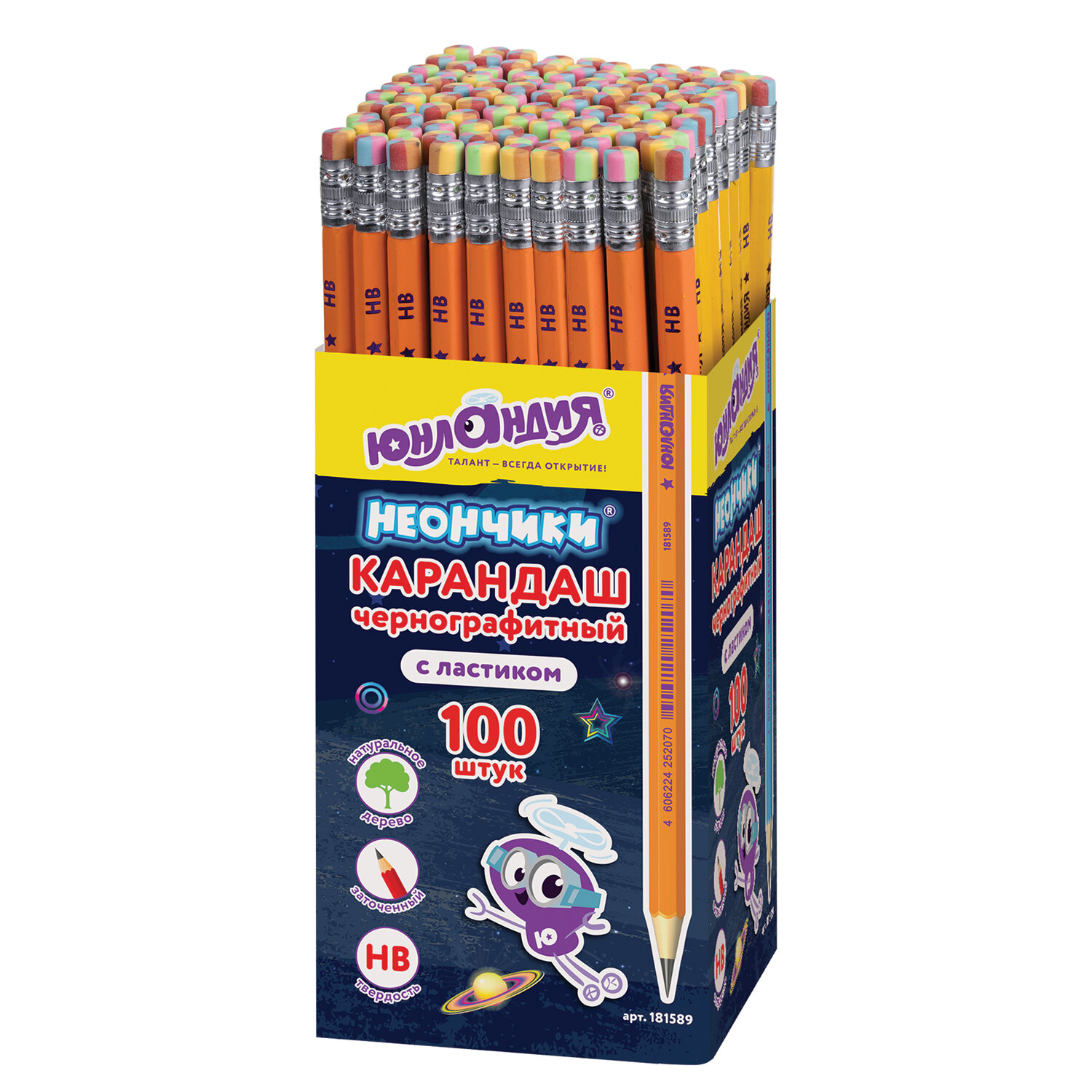 - Карандаш чернографитный ЮНЛАНДИЯ, 1 шт., "Неончики", НВ, корпус ассорти, с резинкой, 181589