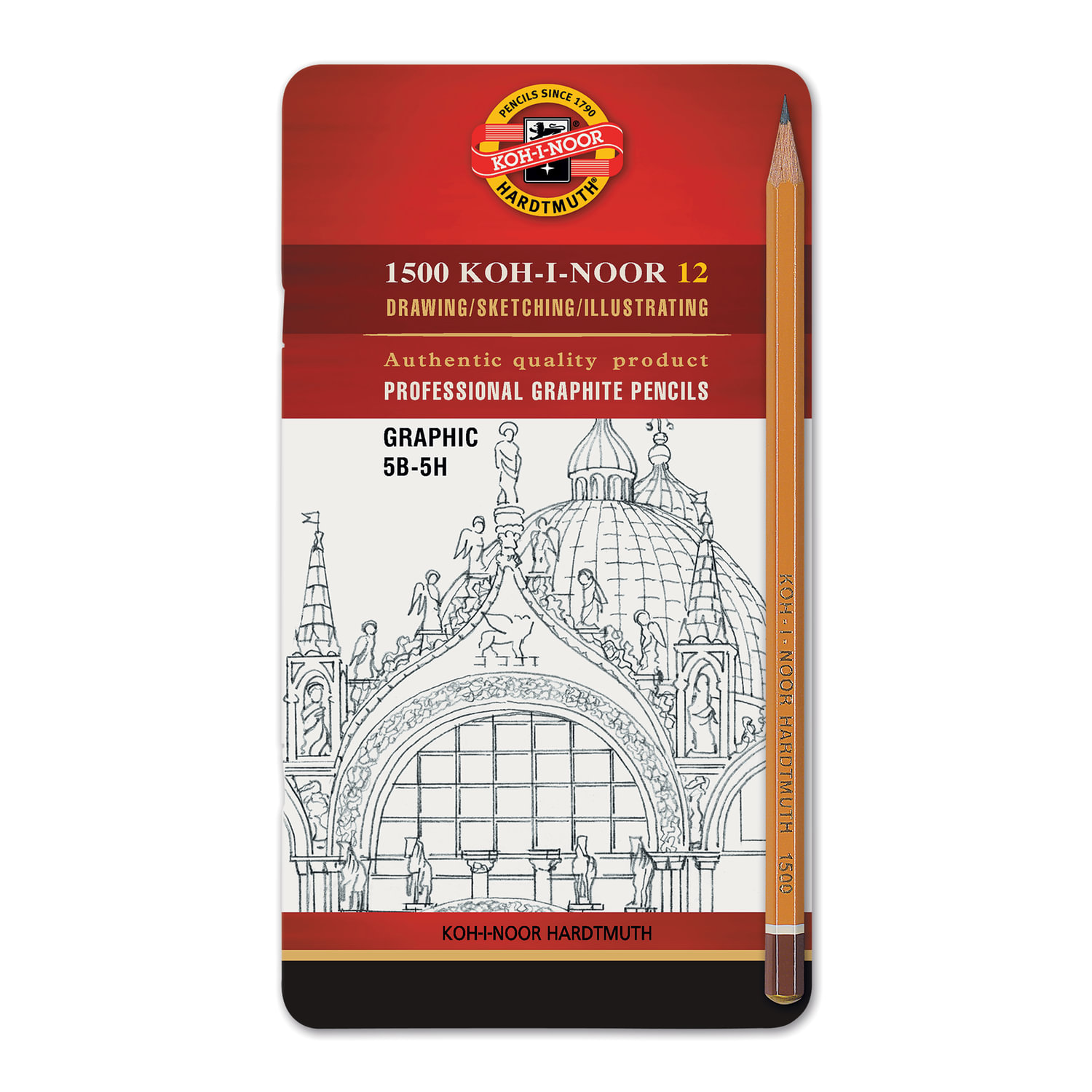 Карандаши, представленные в наборе, поставляюся без ластика, заточенными. Твердости грифеля - 5H-5B. Упаковка - металлическая коробка. Карандаши чернографитные KOH-I-NOOR, НАБОР 12 шт.,"Graphic", 5В-5H, без резинки, 1502012009PL