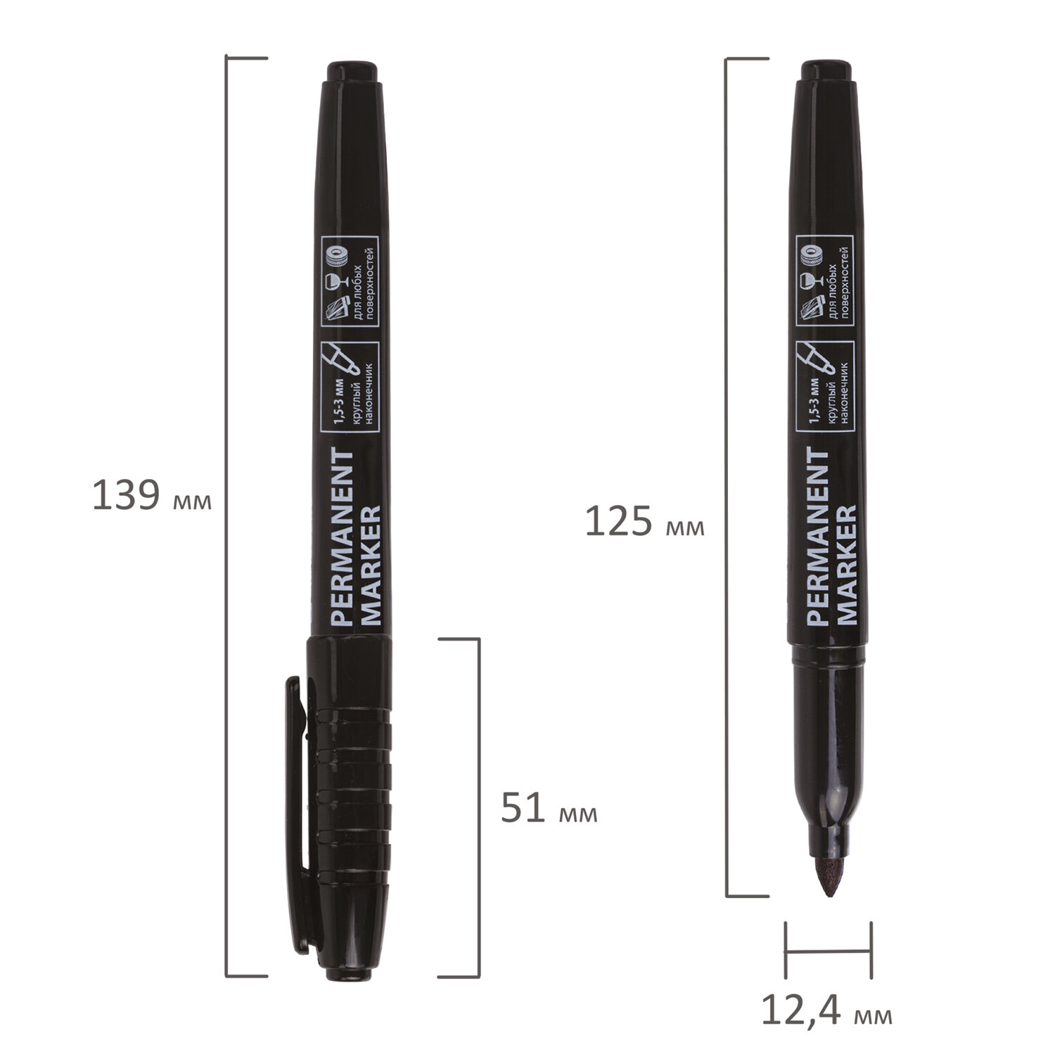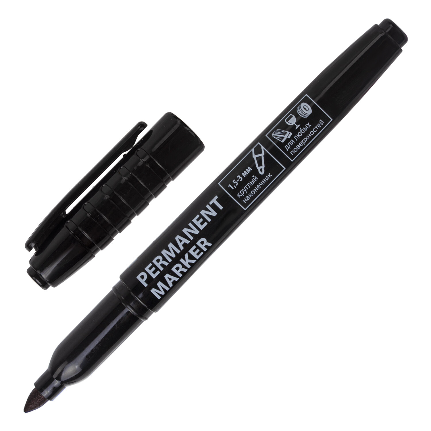 Перманентный маркер черного цвета имеет пластиковый корпус круглой формы диаметром 12,4 мм. Толщина линии письма - 1,5-3 мм в зависимости от угла наклона. Особая нестираемая основа перманентного маркера обеспечивает такие качества, как стойкость к воздействию воды, ультрафиолета, низких и высоких температур. Благодаря спиртовой основе чернила быстро сохнут и не размазываются. Износостойкий фетровый наконечник устойчив к повреждениям и обеспечивает экономный расход чернил.