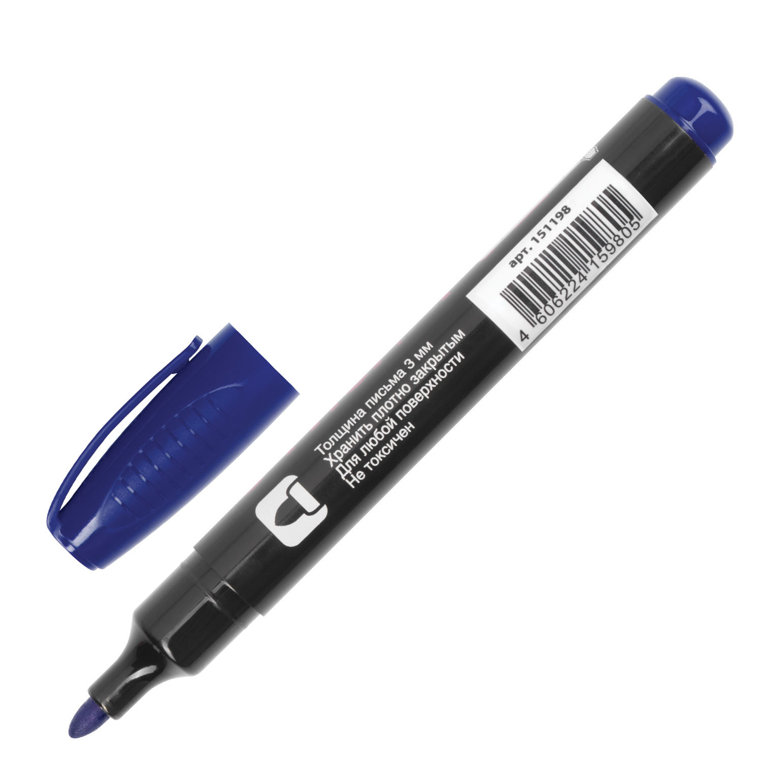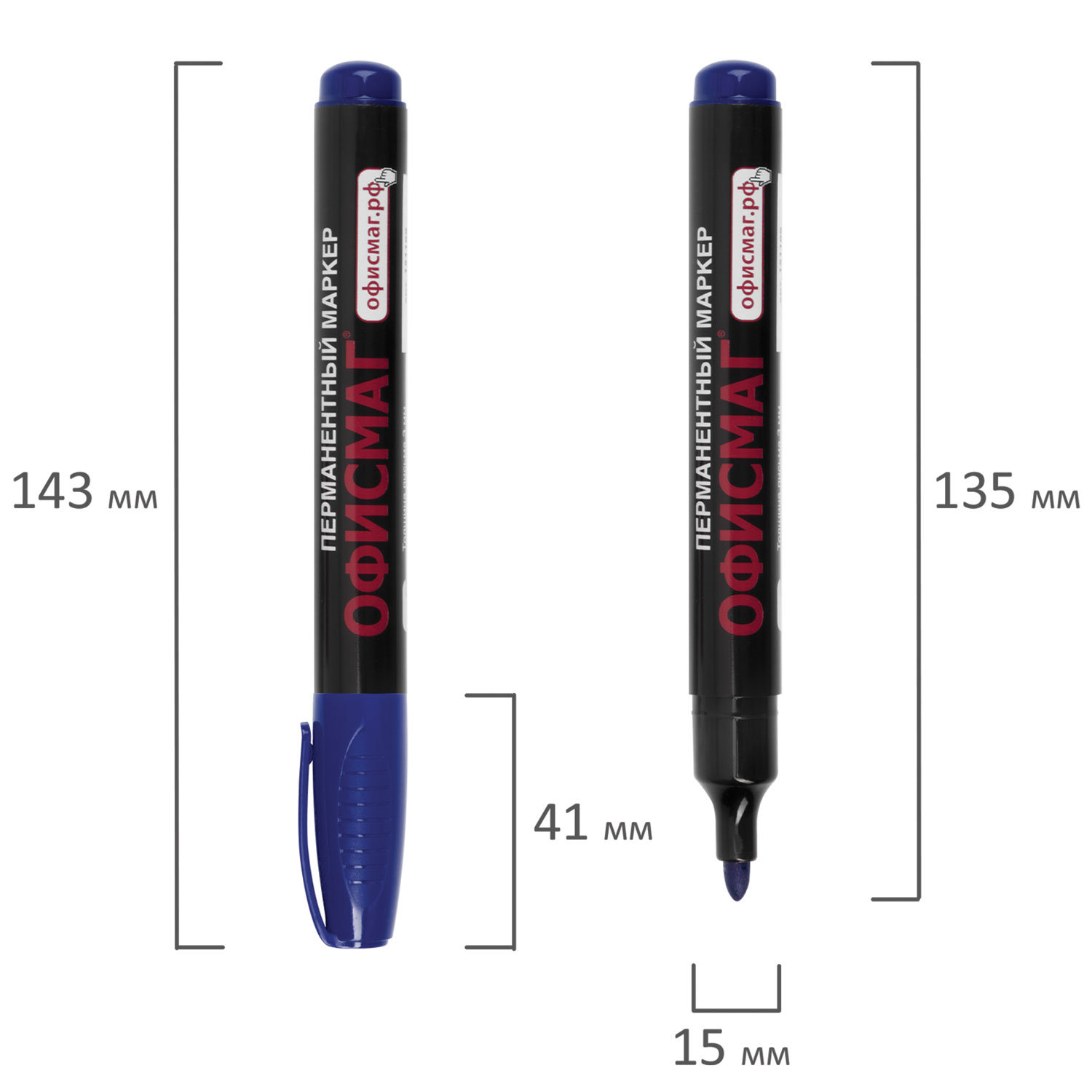 Маркер перманентный синего цвета обладает круглой формой корпуса из пластика, диаметр которого 15 мм. Толщина линии письма - 2,5-4 мм в зависимости от угла наклона. Особая нестираемая основа перманентного маркера обеспечивает такие качества, как стойкость к воздействию воды, ультрафиолету, низких и высоких температур. Благодаря спиртовой основе чернила быстро сохнут и не размазываются. Износостойкий фетровый наконечник устойчив к повреждениям и обеспечивает экономный расход чернил. Изделие не перезаправляется. Плотно закрывается колпачком, что предотвращает высыхание наконечника и чернил. Цвет колпачка соответствует цвету чернил. Маркер перманентный ОФИСМАГ, СИНИЙ, круглый наконечник, 3 мм, с клипом, 151198