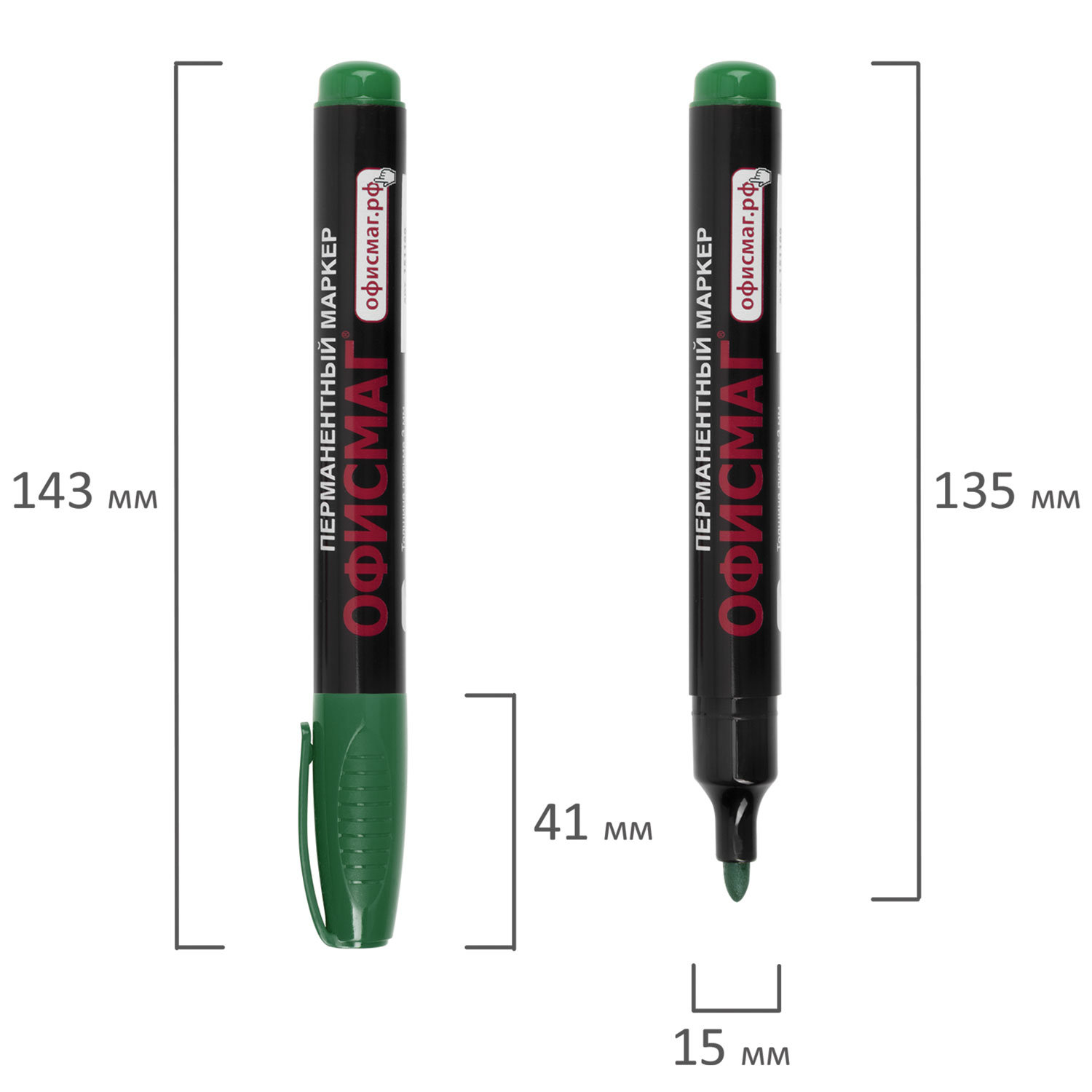 Маркер перманентный зеленого цвета обладает круглой формой корпуса из пластика, диаметр которого 15 мм. Толщина линии письма - 2,5-4 мм в зависимости от угла наклона. Особая нестираемая основа перманентного маркера обеспечивает такие качества, как стойкость к воздействию воды, ультрафиолету, низких и высоких температур. Благодаря спиртовой основе чернила быстро сохнут и не размазываются. Износостойкий фетровый наконечник устойчив к повреждениям и обеспечивает экономный расход чернил. Изделие не перезаправляется. Плотно закрывается колпачком, что предотвращает высыхание наконечника и чернил. Цвет колпачка соответствует цвету чернил. Маркер перманентный ОФИСМАГ, ЗЕЛЕНЫЙ, круглый наконечник, 3 мм, с клипом, 151200