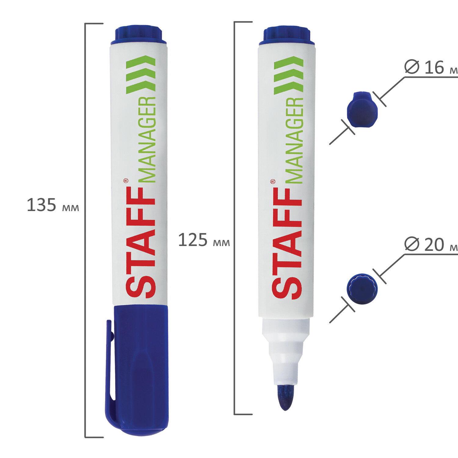 Маркер для доски синего цвета обладает круглым пластиковым корпусом диаметром 20 мм. Наконечник круглой формы обеспечивает толщину линии письма 5 мм, что позволяет писать крупным шрифтом, который будет хорошо виден. Благодаря спиртовой основе чернила быстро высыхают и не оставляют разводов, легко стираются сухой губкой. Изделие не перезаправляется. Цвет колпачка соответствует цвету чернил. Маркер стираемый для белой доски СИНИЙ, STAFF "Manager" WBM-491, 5 мм, с клипом, 151492