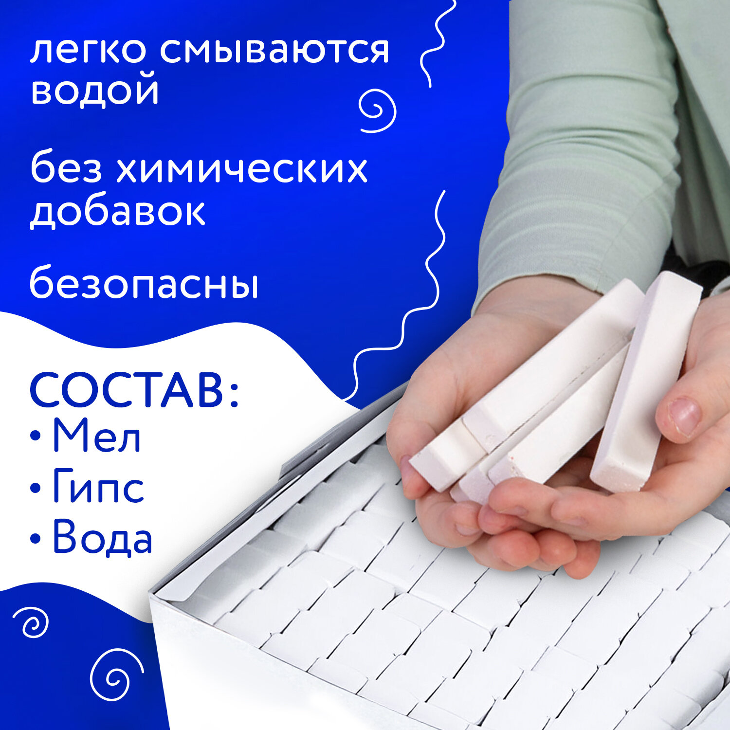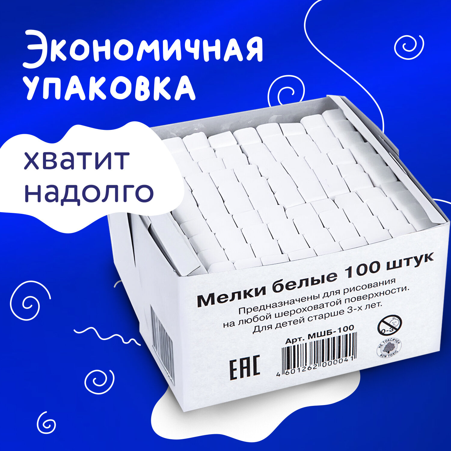 Изготовлен из высококачественного природного сырья без химических добавок. Не содержит твердых включений и не портит поверхность досок. Мел белый квадратный 100 штук, АЛГЕМ, картонная упаковка, 00041, МШБ 100